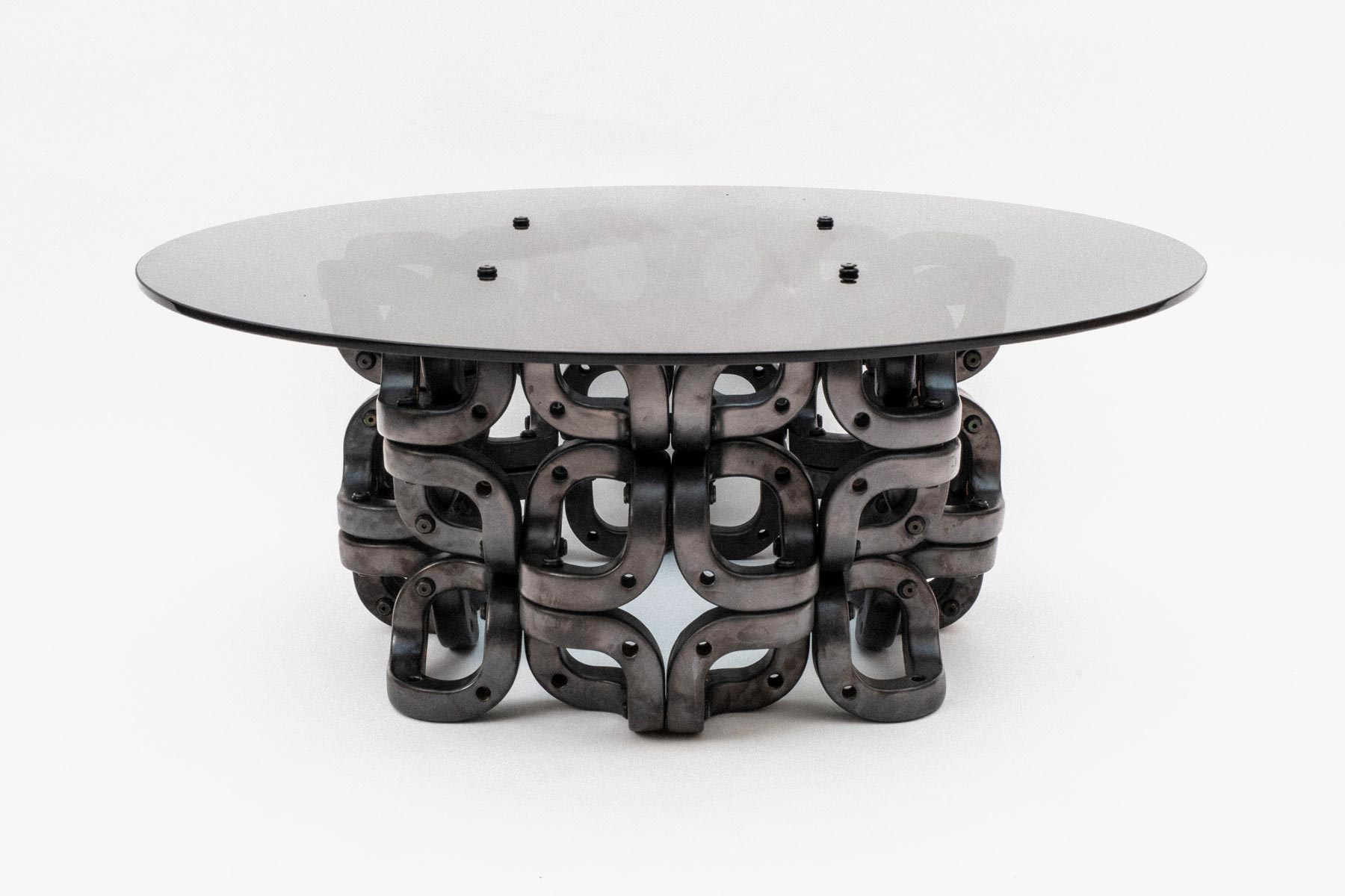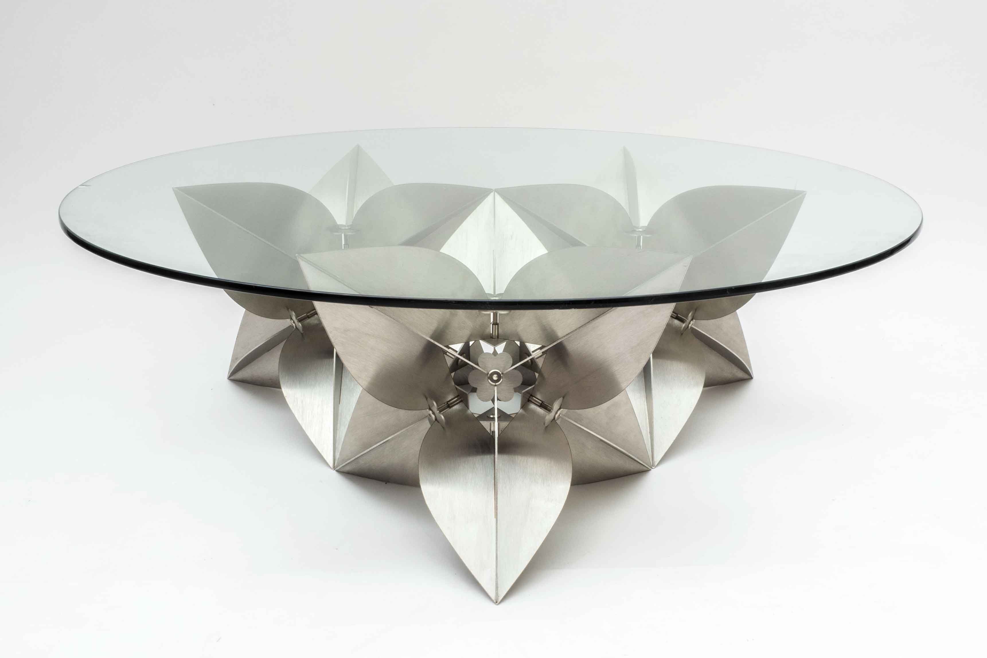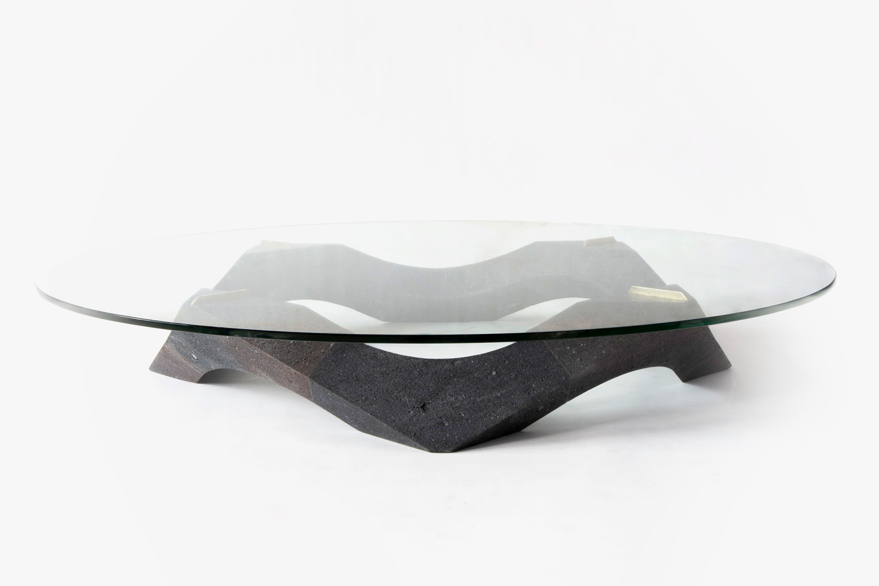The unique use of lava stone, brass and glass imbues the table with a remarkable fusion of robustness and delicacy.