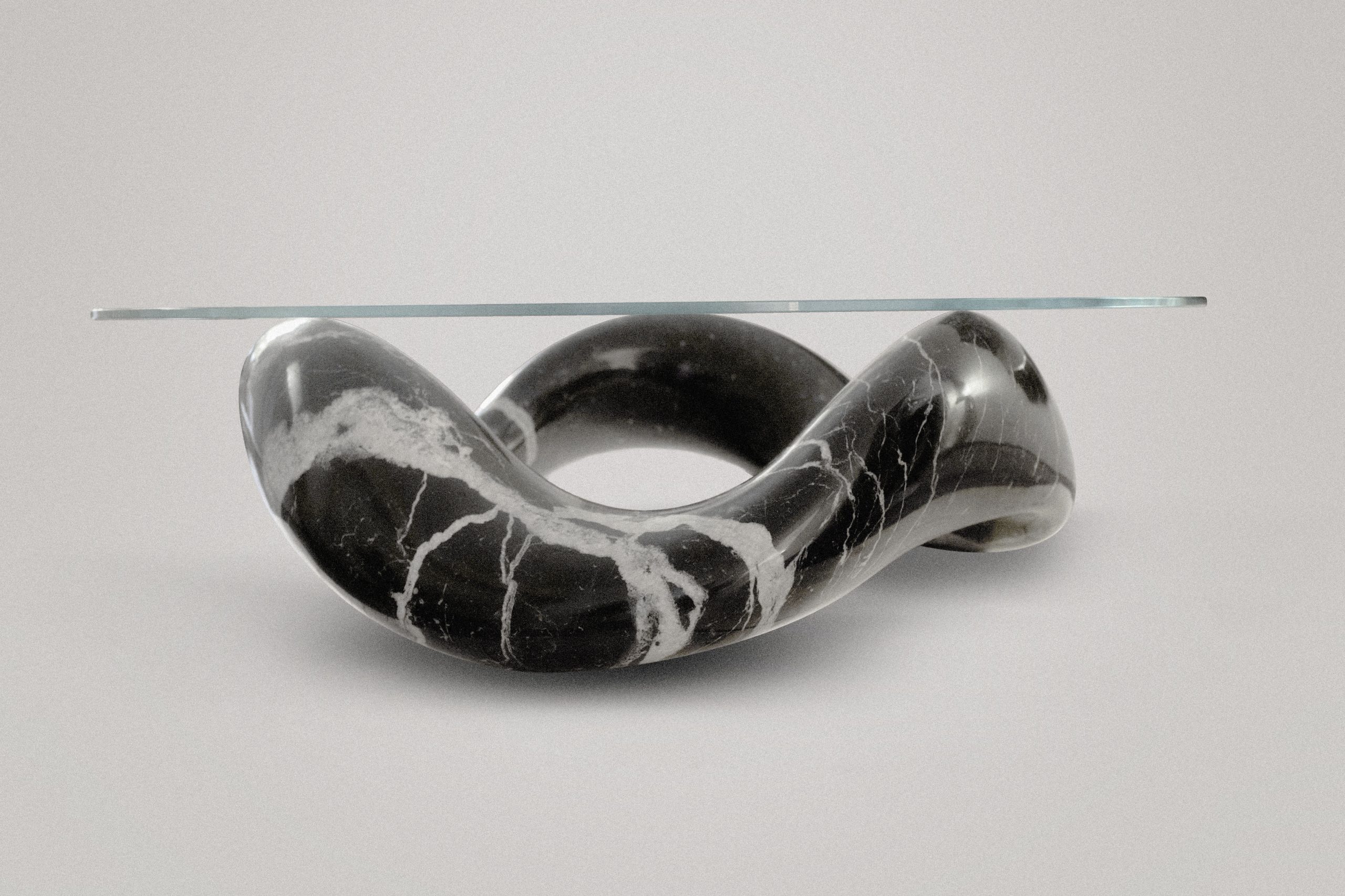 A table base that seamlessly blends the inherent beauty of marble with fluidity and mathematical intrigue.