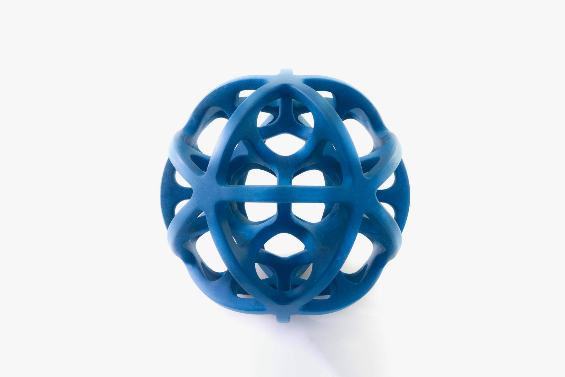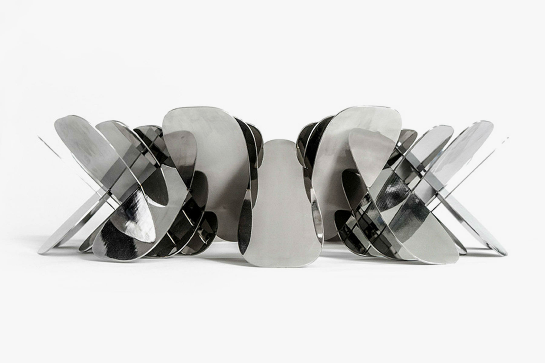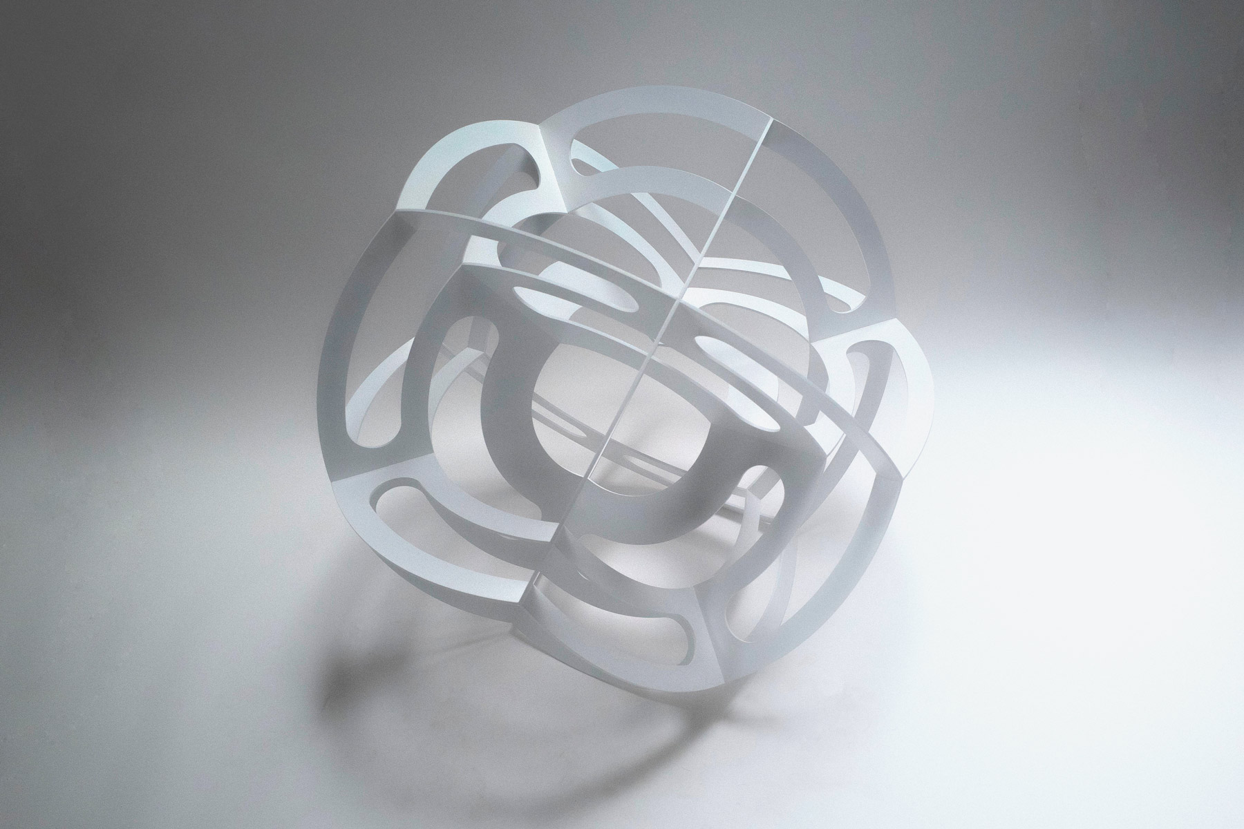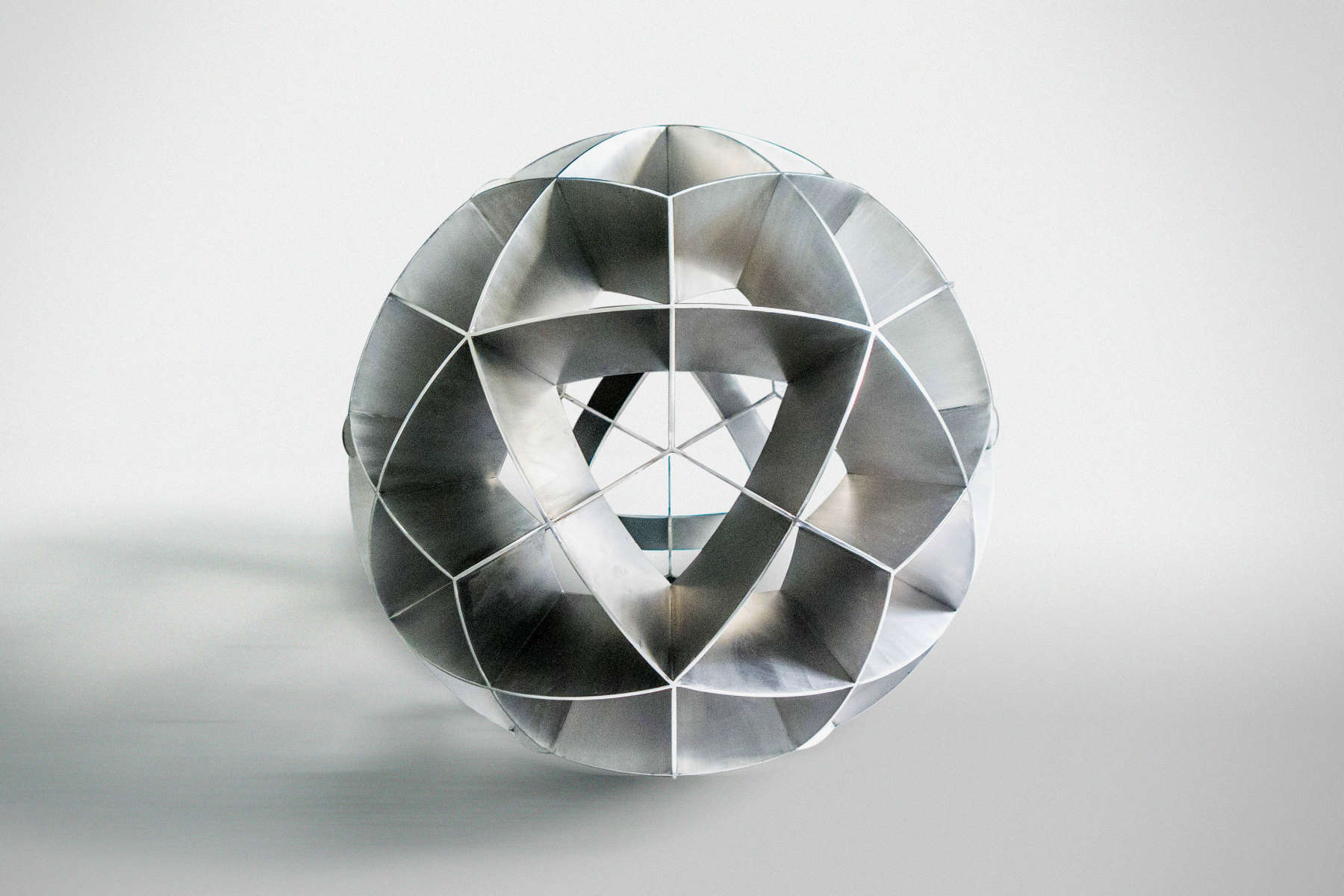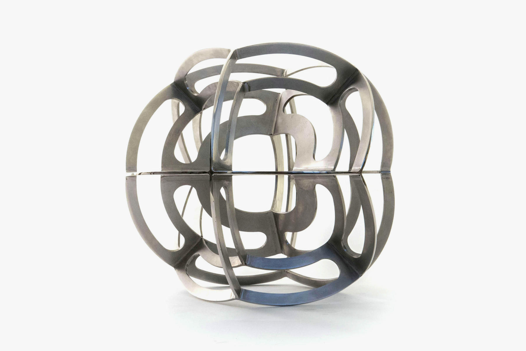 Fabricated from a single stainless steel module that repeats itself thirty times to create a perfect sphere.