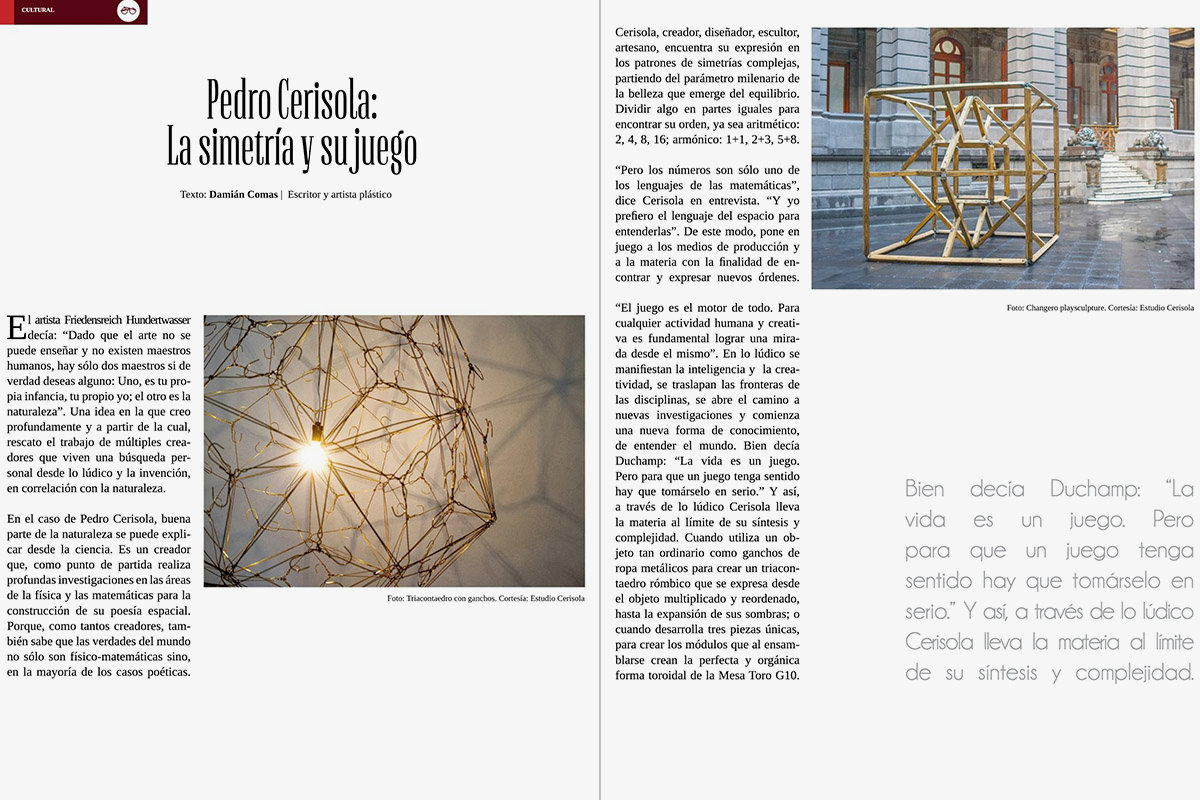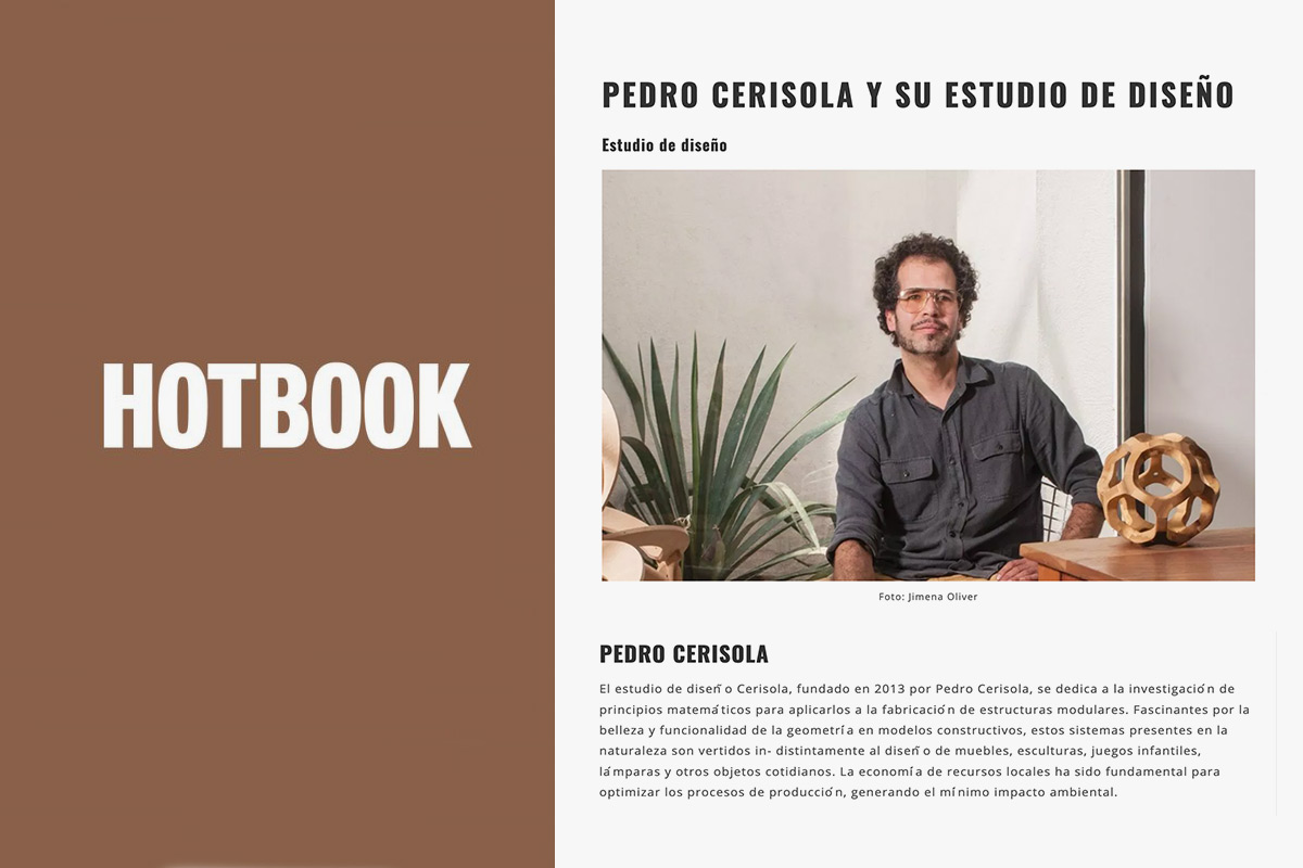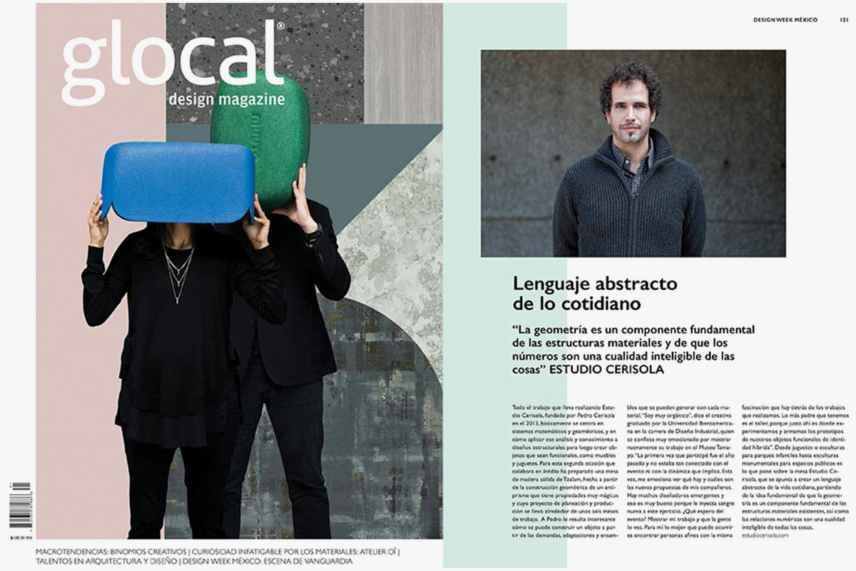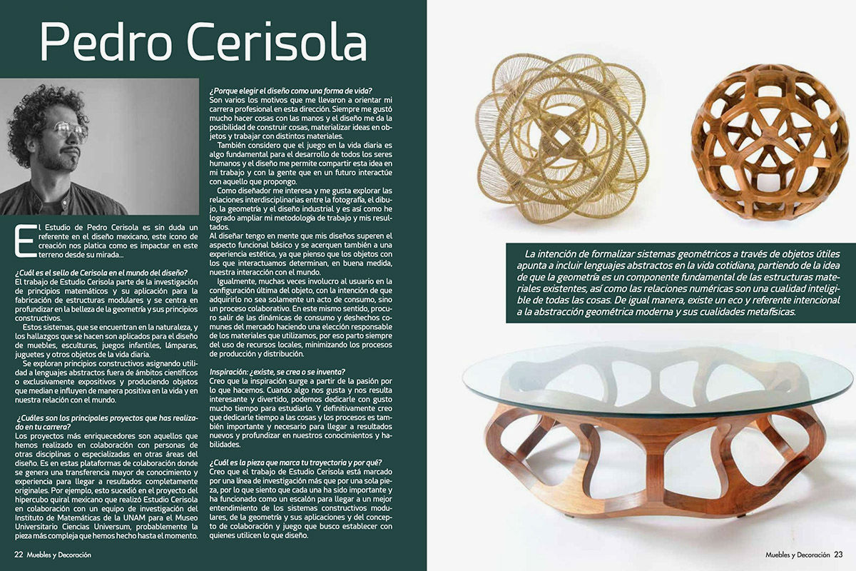 Arte por excelencias Las ecuaciones de CerisolaFEBRUARY 2019 Mexico Design Zona MACO 2019FEBRUARY 2019 Wallpaper At Zona Maco Diseño, Mexico’s art of collaboration gets experimentalFEBRUARY 2019 Glocal Design Magazine Estudio Cerisola, diseño modularFEBRUARY 2019 Hotbook Pedro Cerisola y su estudio de diseñoEnero 2019 Orígenes México No. 06 La simetría y su juegoDecember 2018 Glocal Design Magazine HipercuboOCTOBER 2018 Muebles y Decoración No. 138 Pedro CerisolaOctubre 2018 Coolhunter Paradas para vivir el diseño en el Abierto Mexicano de DiseñoOCTOBER 2018 Podio Mexico Design Time en el LDF 2018SEPTEMBER 2018 Coolhunter Visión y tradición cambia el formato para esta ediciónSEPTEMBER 2018 Di RadioDiseñando ando Ep:12 Estudio CerisolaAUGUST 2018 Coolhunter Proyectos mexicanos en Wanted DesignMAY 2018 Glocal Design Magazine No. 42 Lo mejor del añoDecember 2017 Glocal Design Magazine No. 41 Design Week MéxicoNovember 2017 Plataforma Local Estudio Cerisolaoctober 2017 Designaholic Conociendo a Pedro CerisolaSEPTEMBER 2016 Underdog Verano Archivo. Diseño en procesoJULY 2016 Monocle No. 93 Report Mexico CityMay 2016 Hello DF Hello DF recomienda la muestra “Todo es perfecto”NOVEMBER 2014 Unduetre Stella Pedro CerisolaFebruary 2014 City Life & Style No. 16 Yo sí creoFebruary 2014 Singulares Animanes by Pedro CerisolaOCTOBER 2013 Petit & Small AnimanesOCTOBER 2013