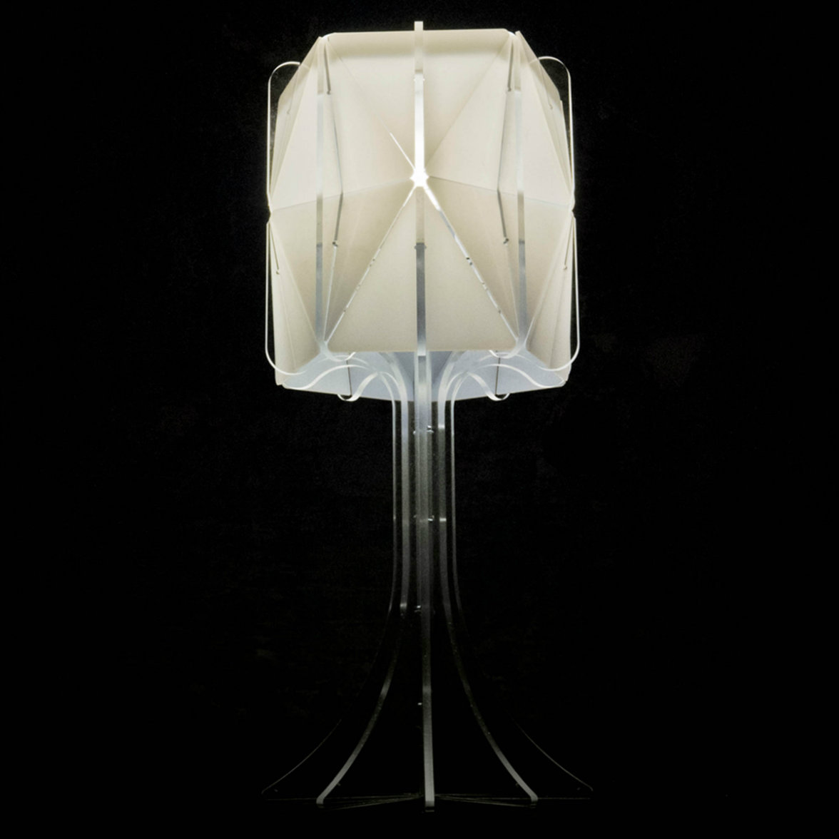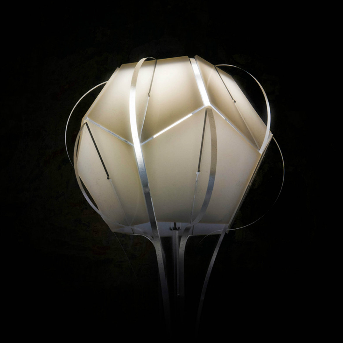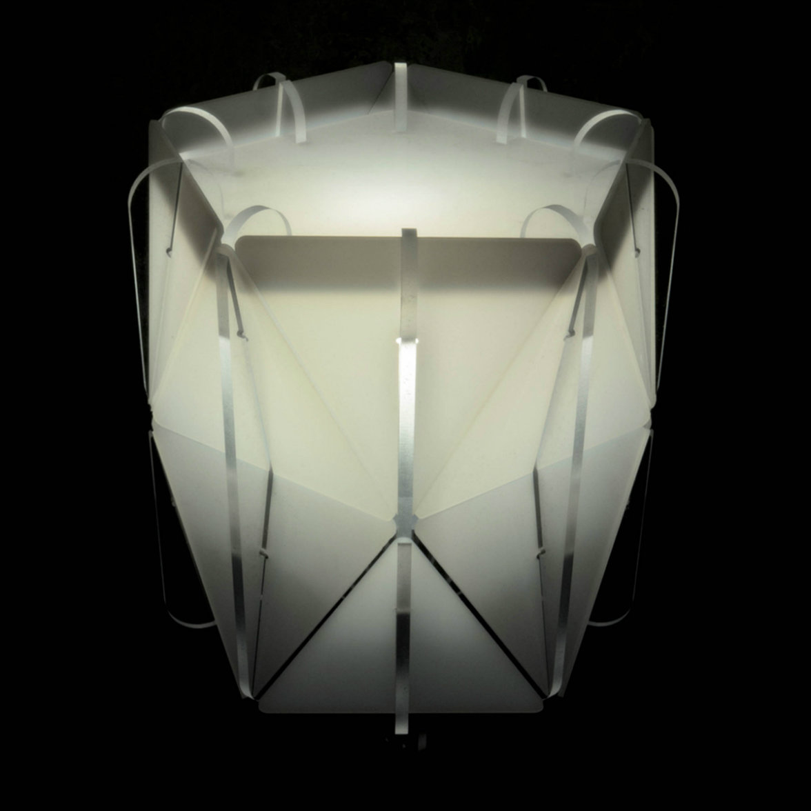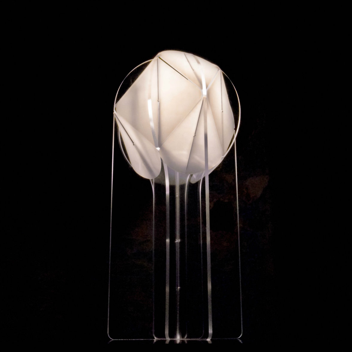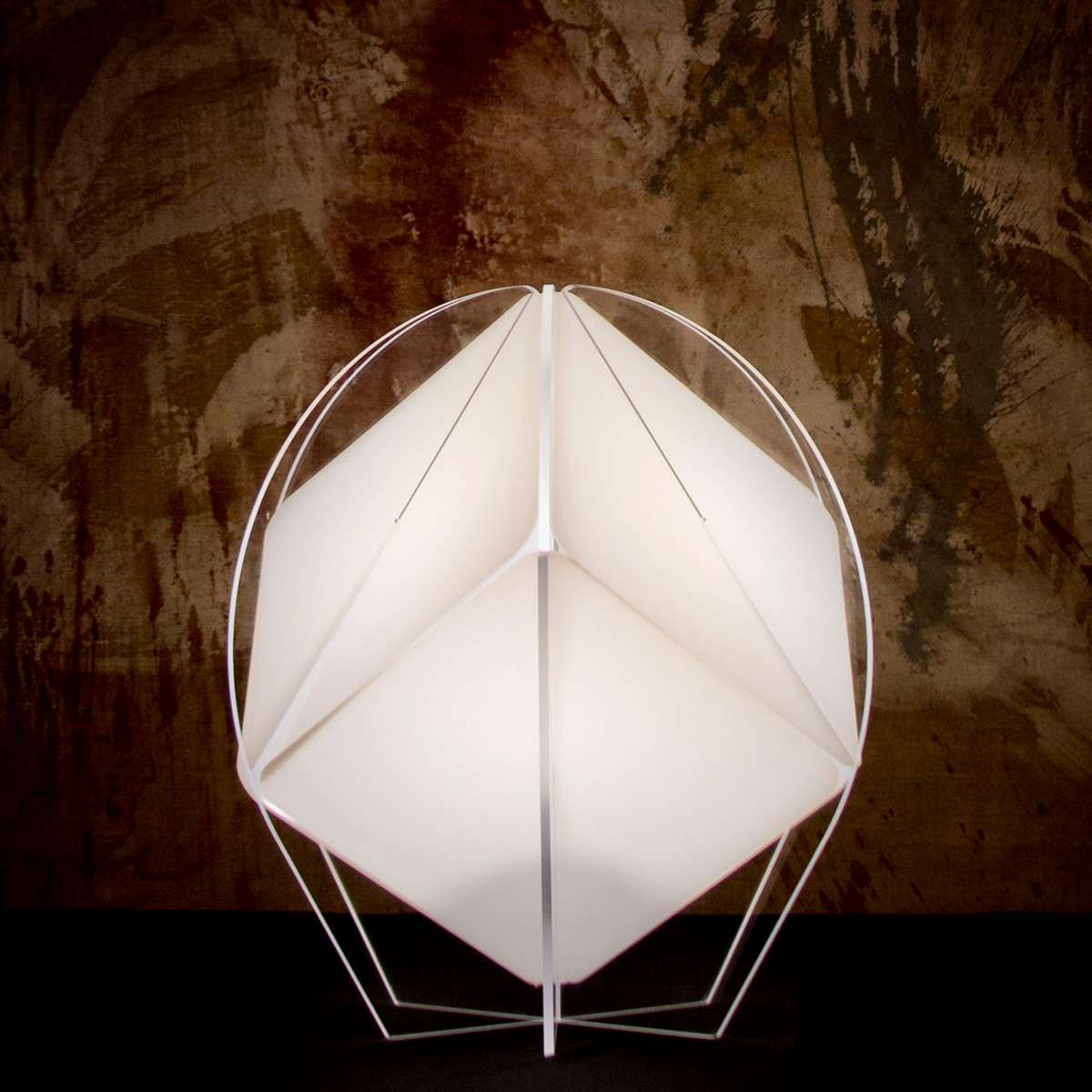 The lamp emerges from the geometric structure of the regular icosahedron the Platonic solid of twenty faces with the shape of equilateral triangles.