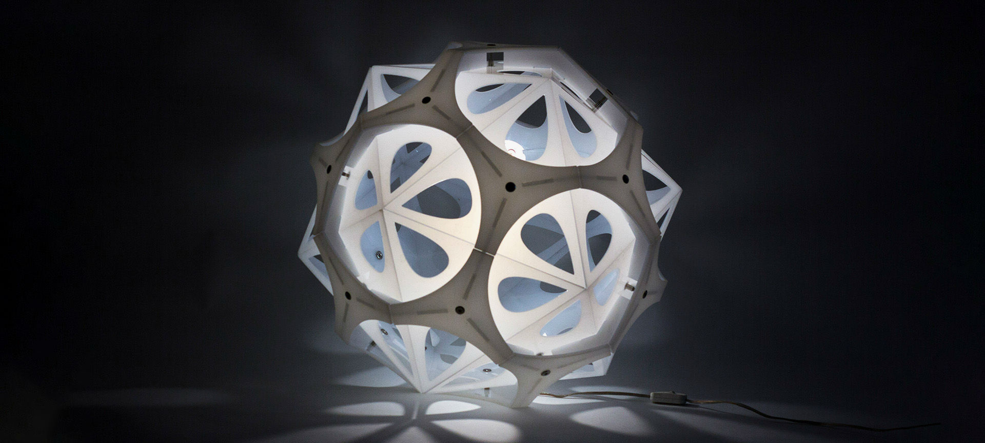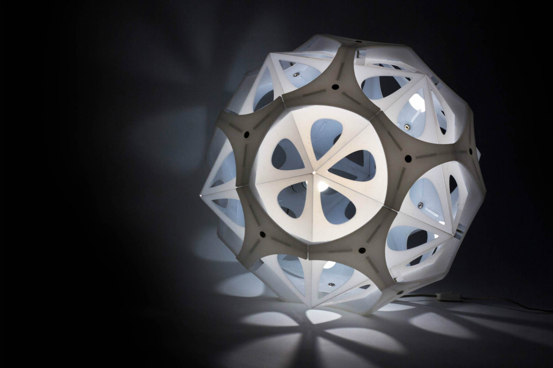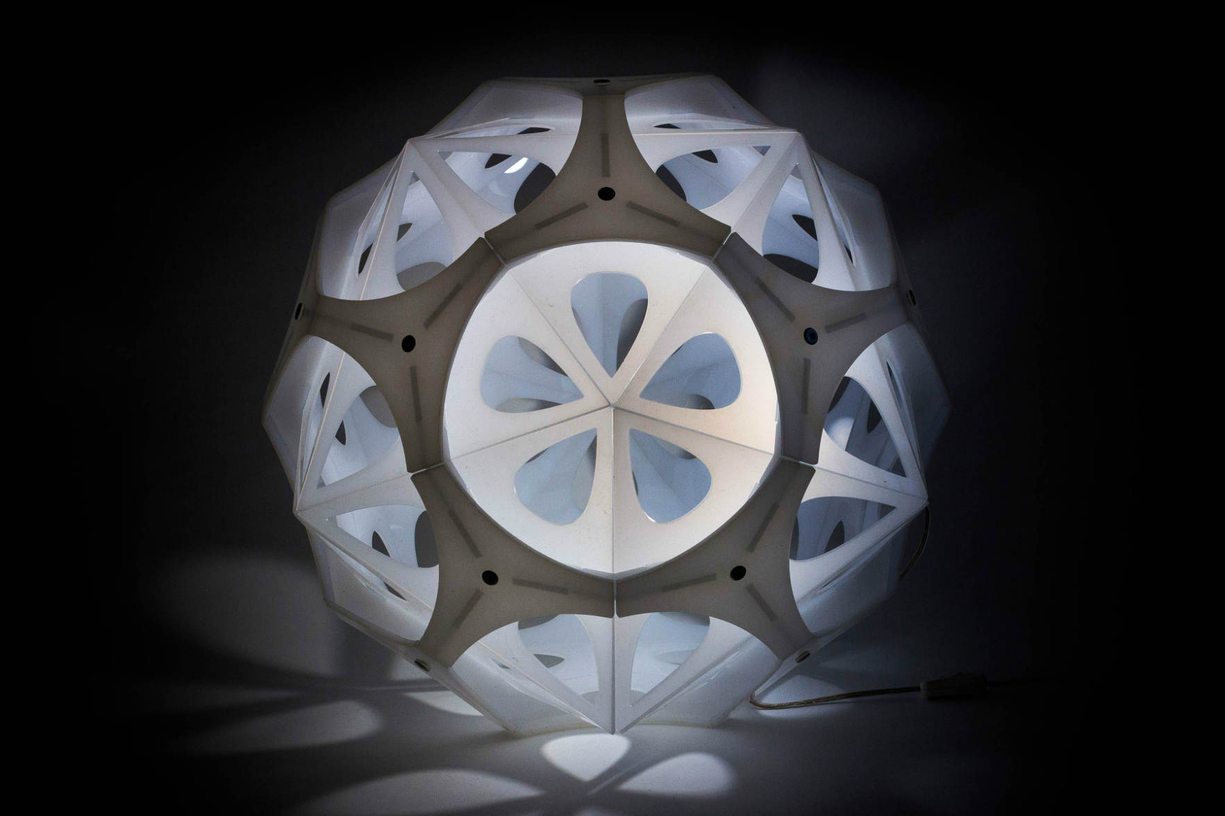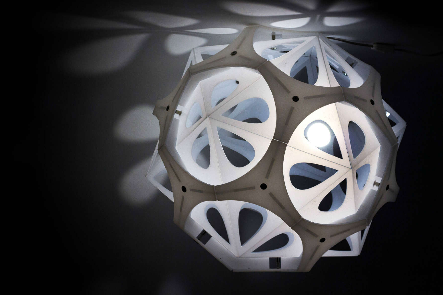 Borealis is the large basin in the Northern hemisphere of planet Mars that covers 40% of the planet. This Martian inspired pendant lamp is constructed solely of acrylic pieces. Its complexity pushes the boundaries of a typical spherical pendant light and its geometry allows to create a diffusing light that originates a warm and unique ambient.