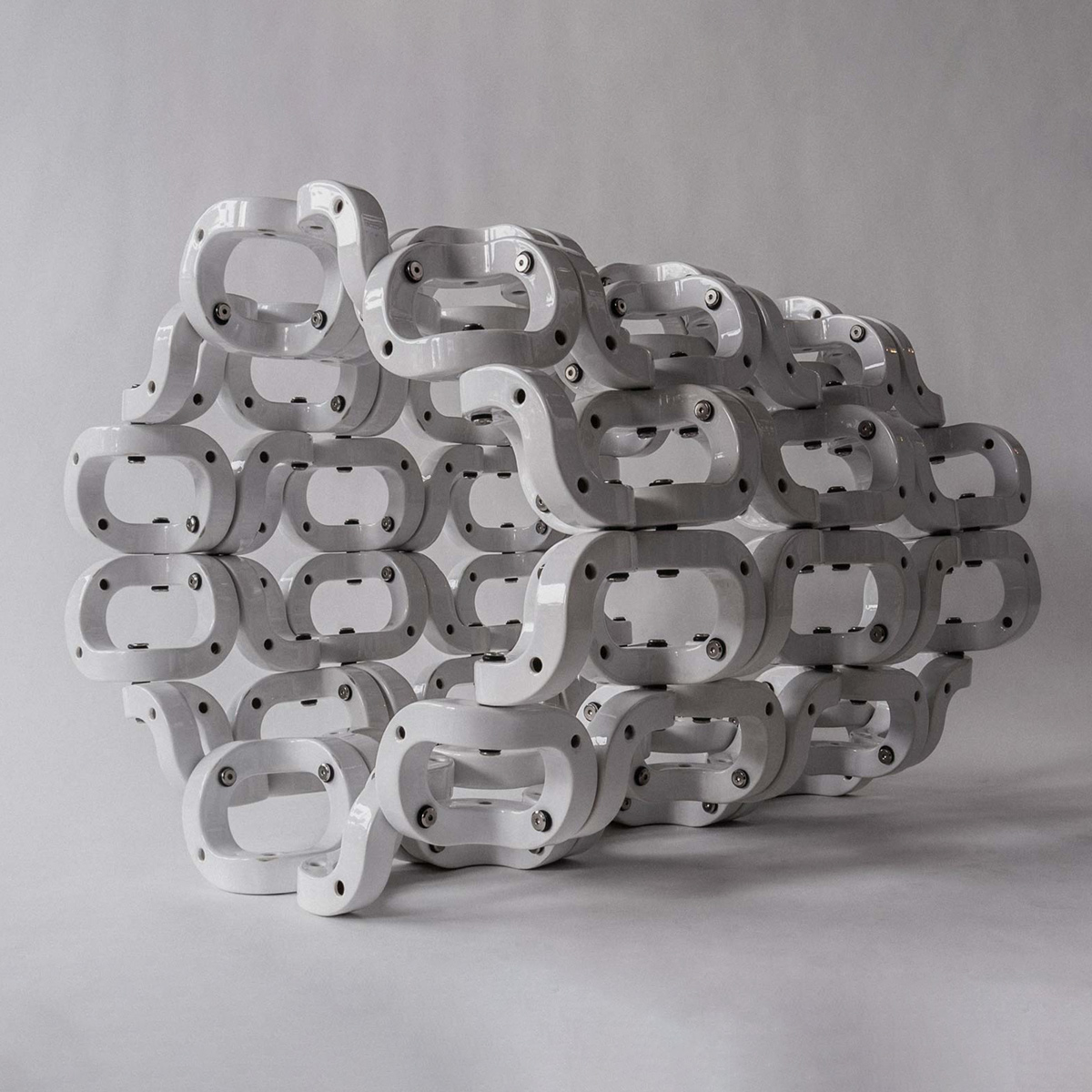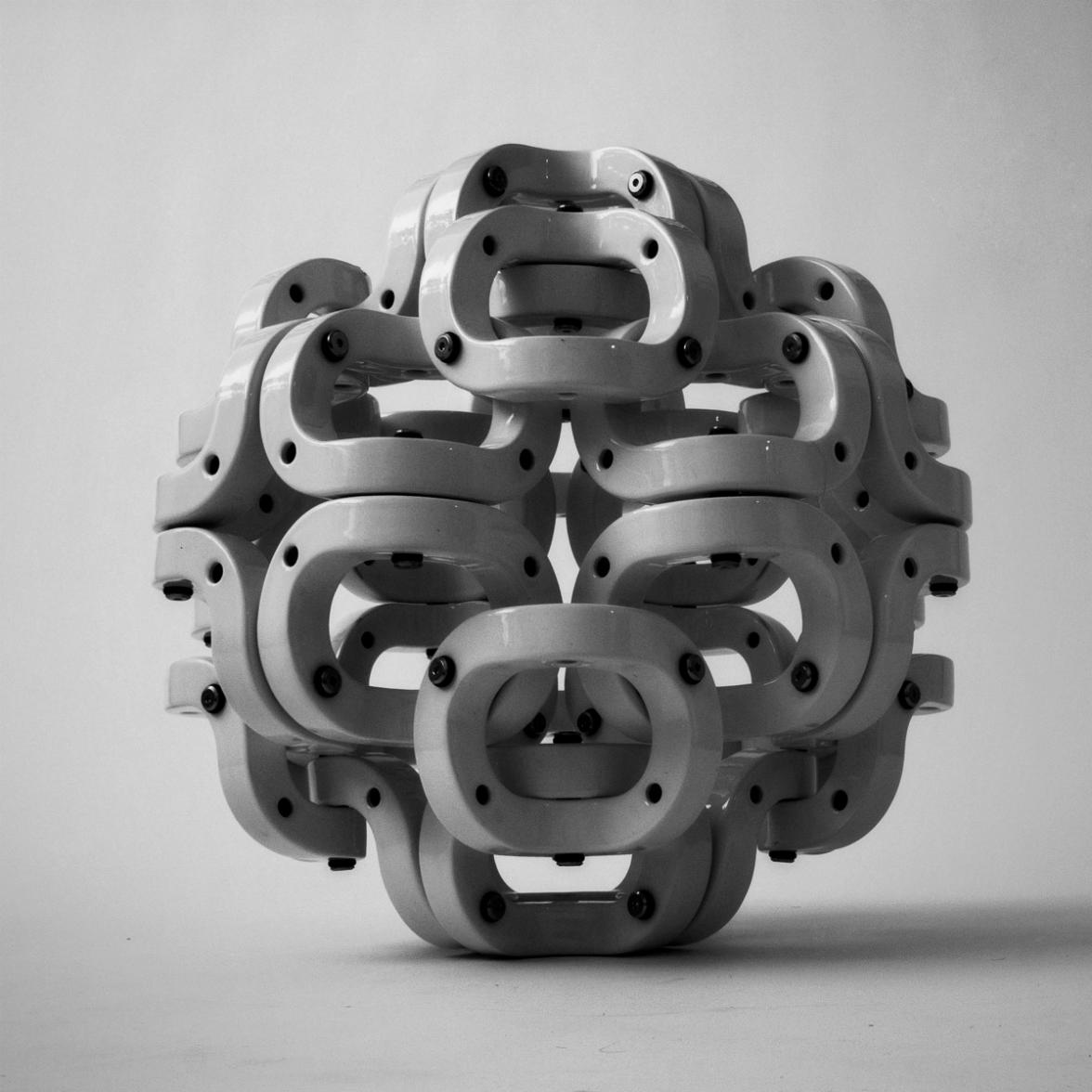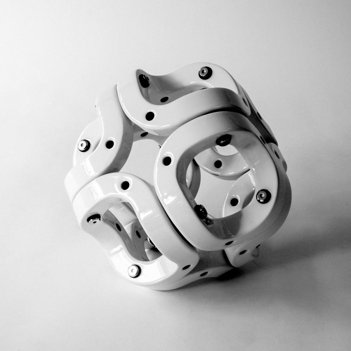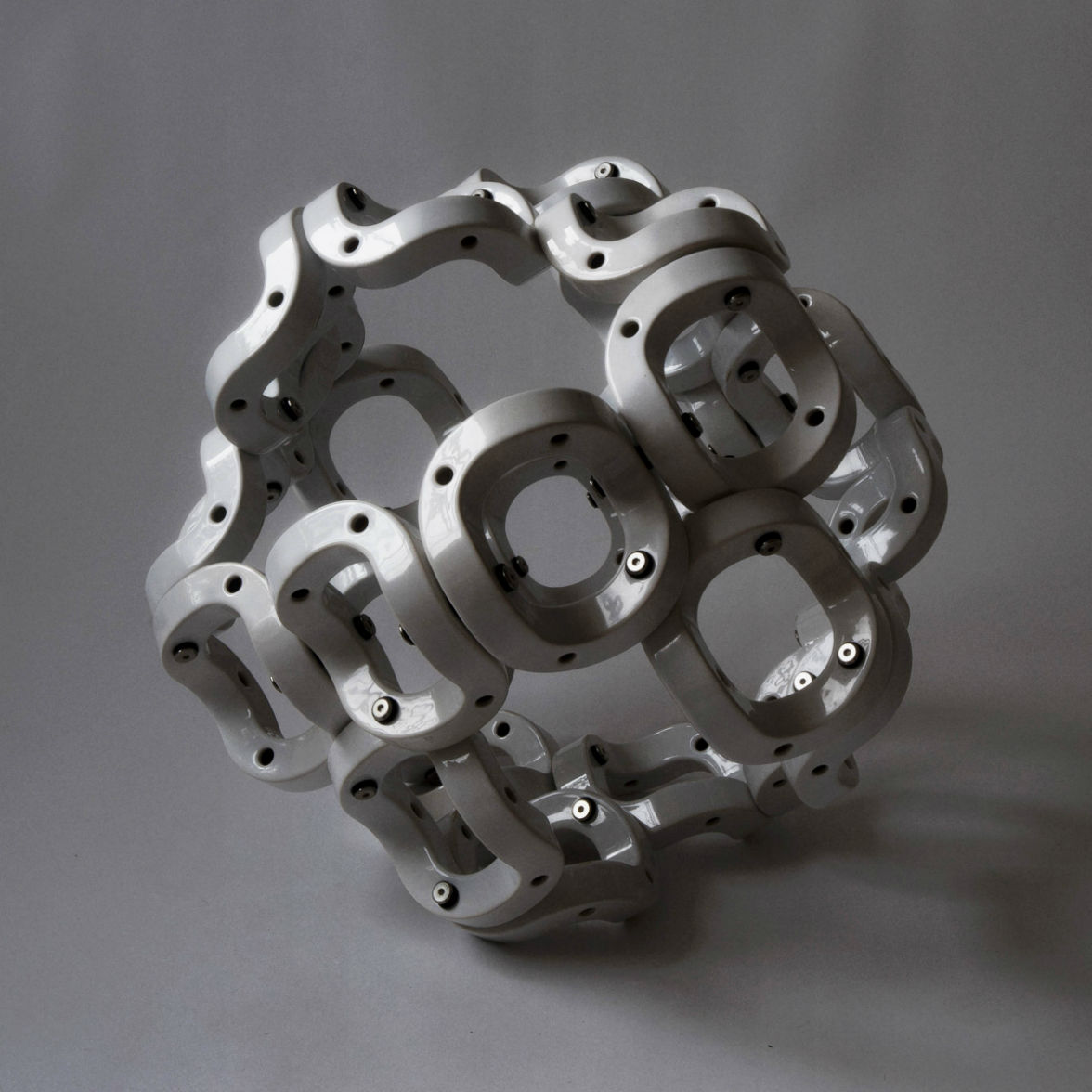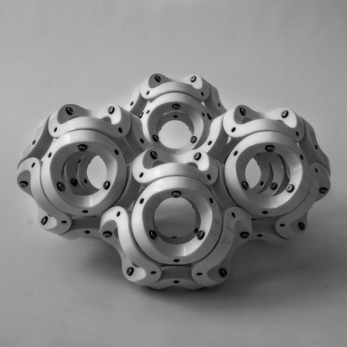 This sculptural geometric system emerged, inspired by the modular possibilities of the cuboctahedron as outlined in Buckminster Fuller’s Synergetics, a seminal work in contemporary geometric studies.