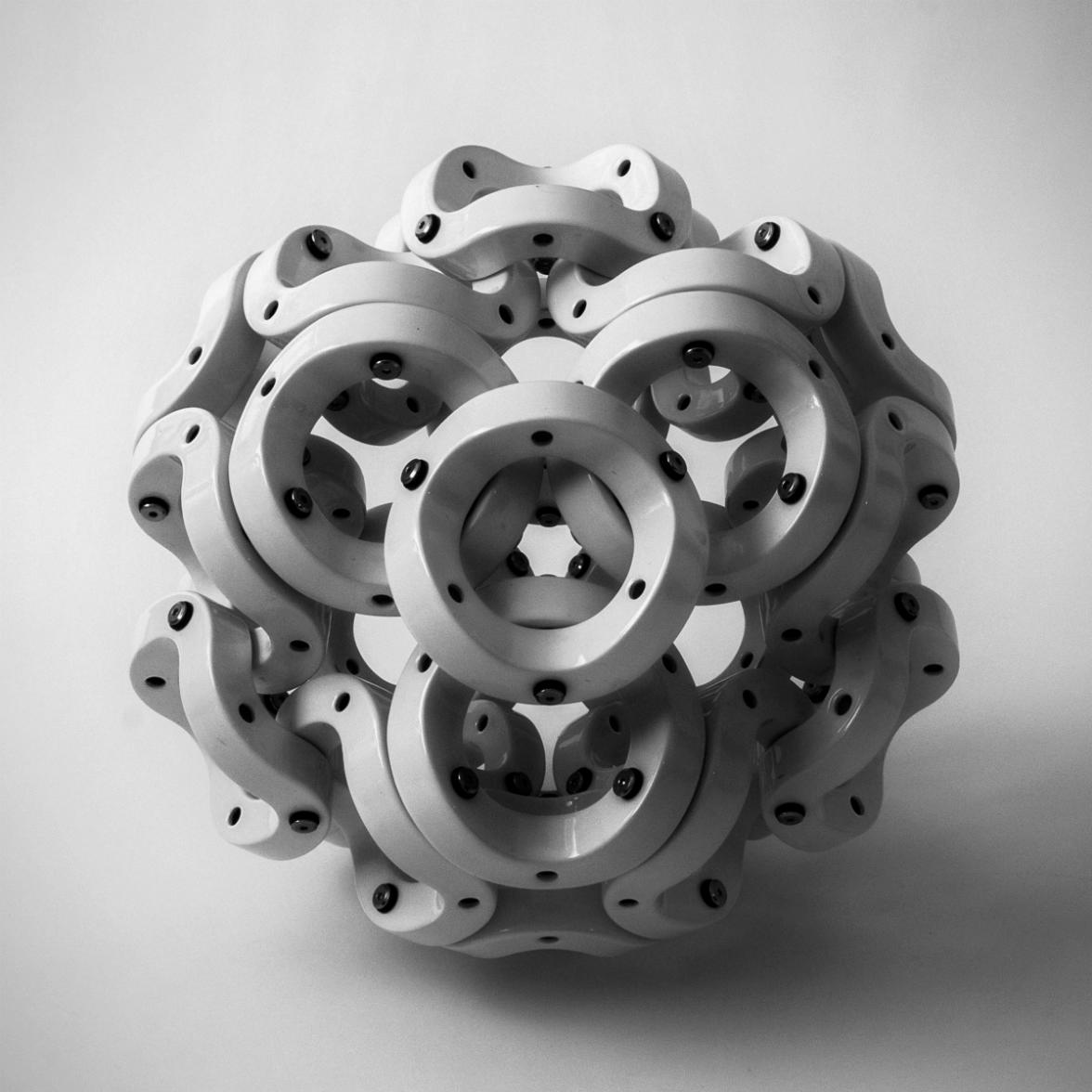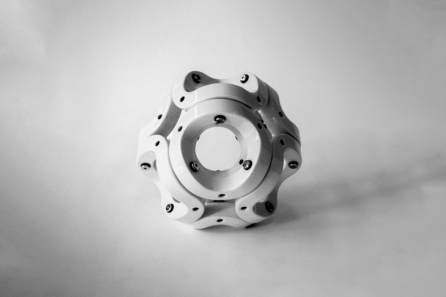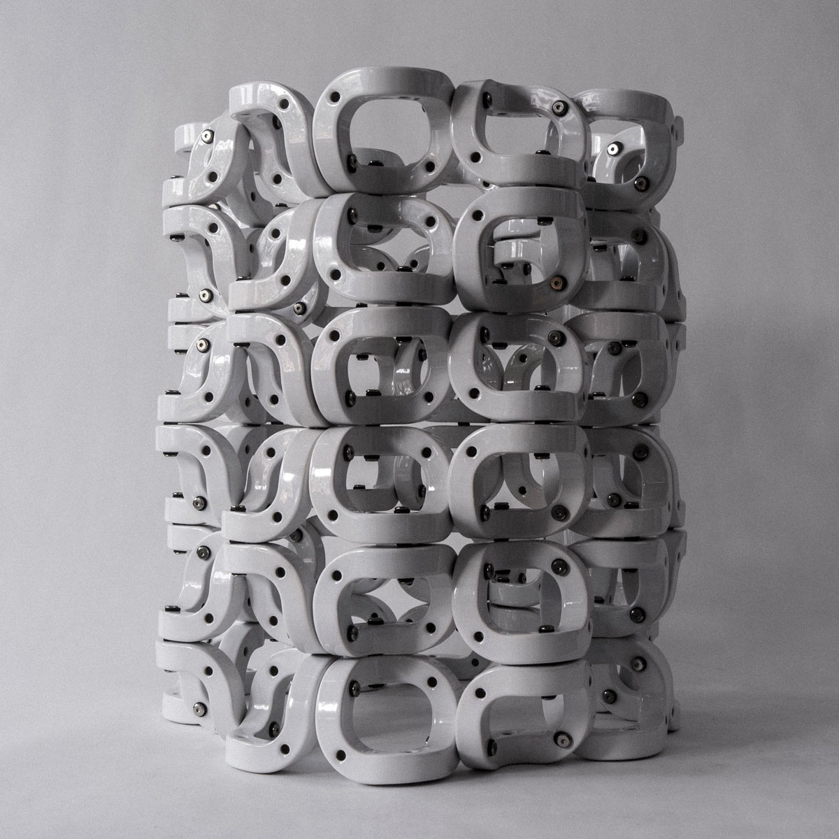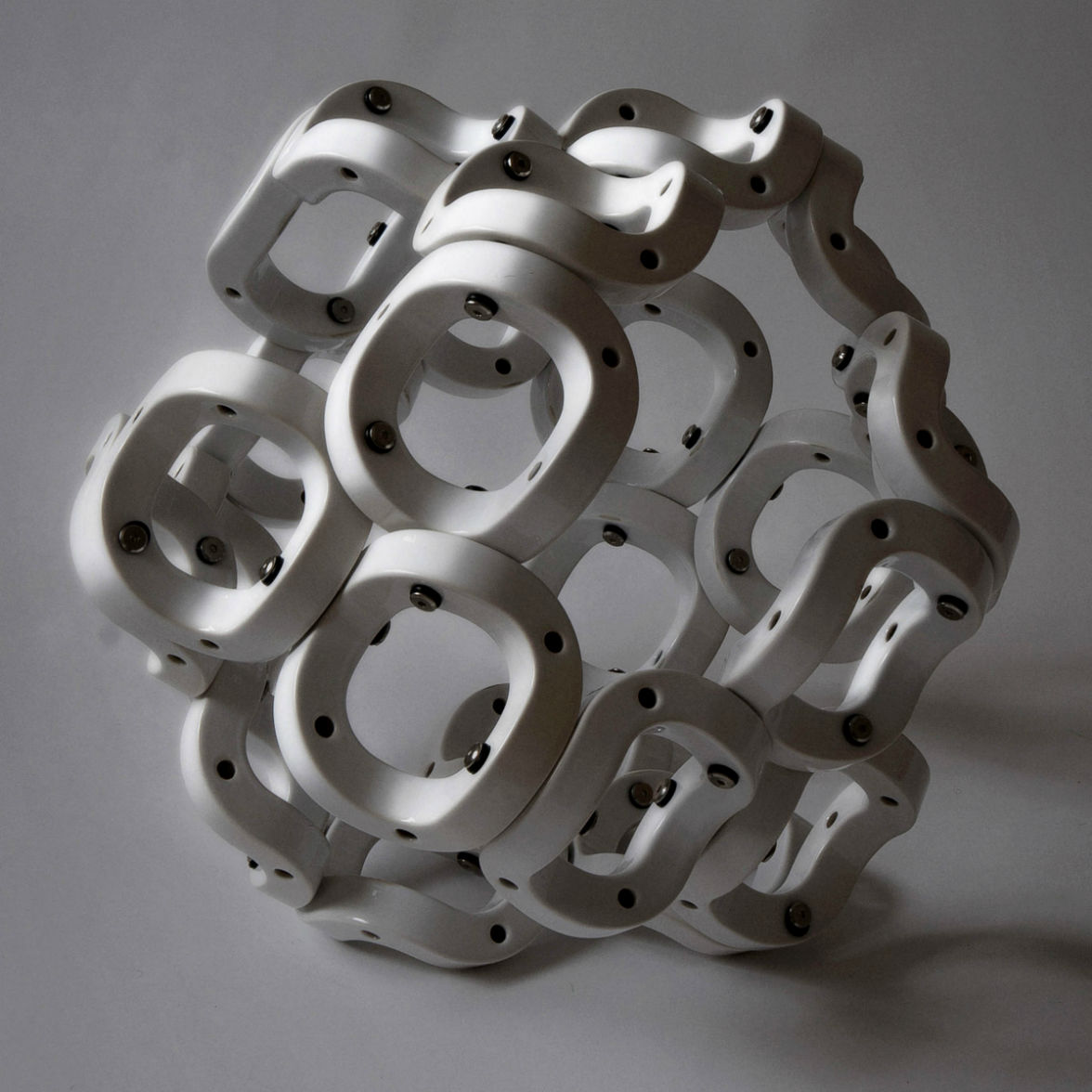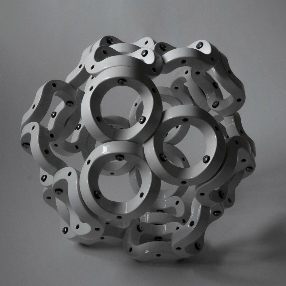 This sculptural geometric system emerged, inspired by the modular possibilities of the cuboctahedron as outlined in Buckminster Fuller’s Synergetics, a seminal work in contemporary geometric studies.