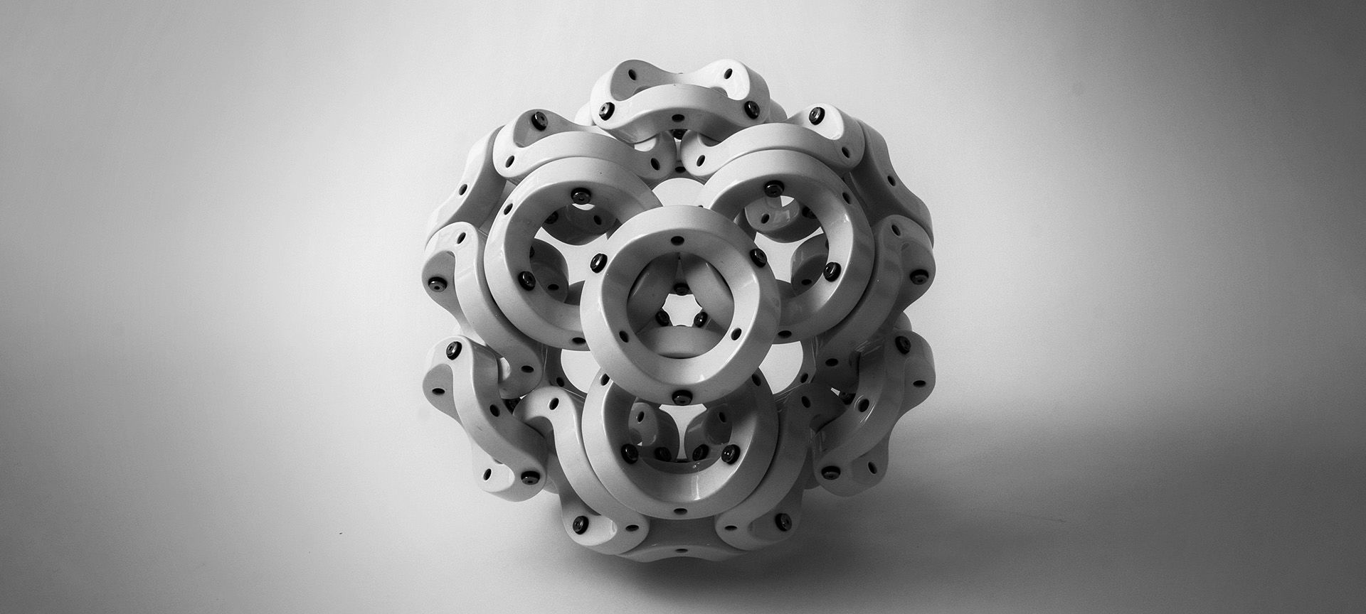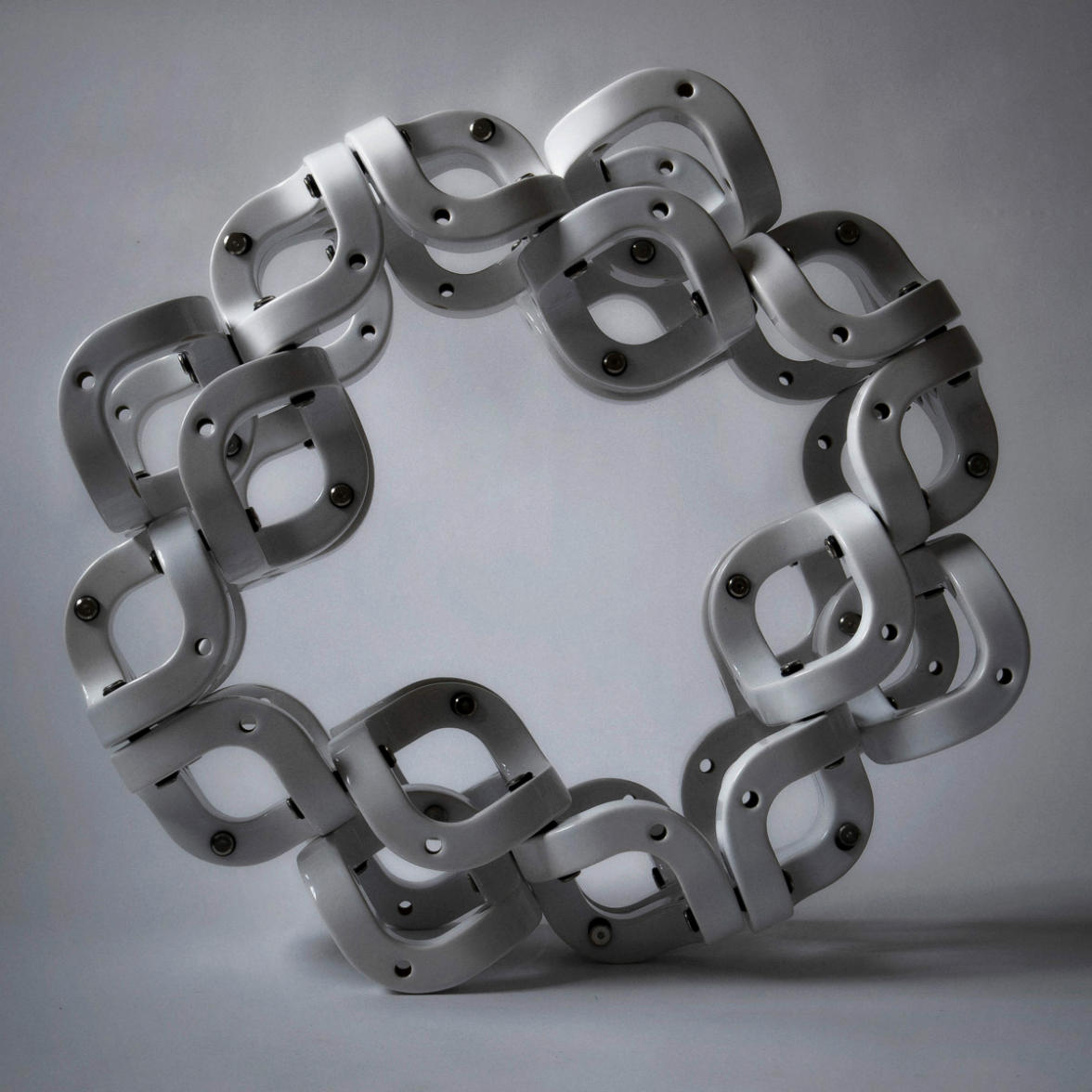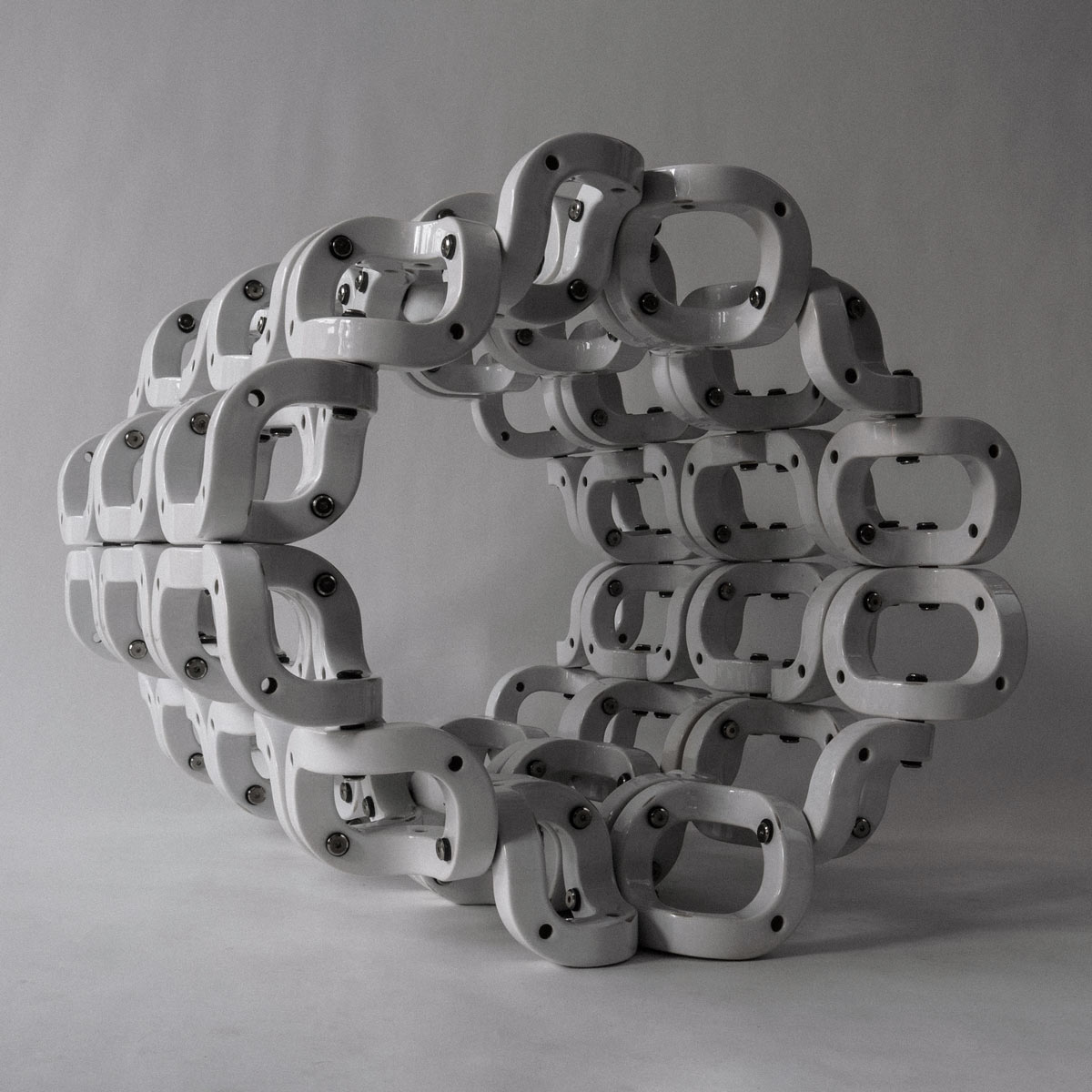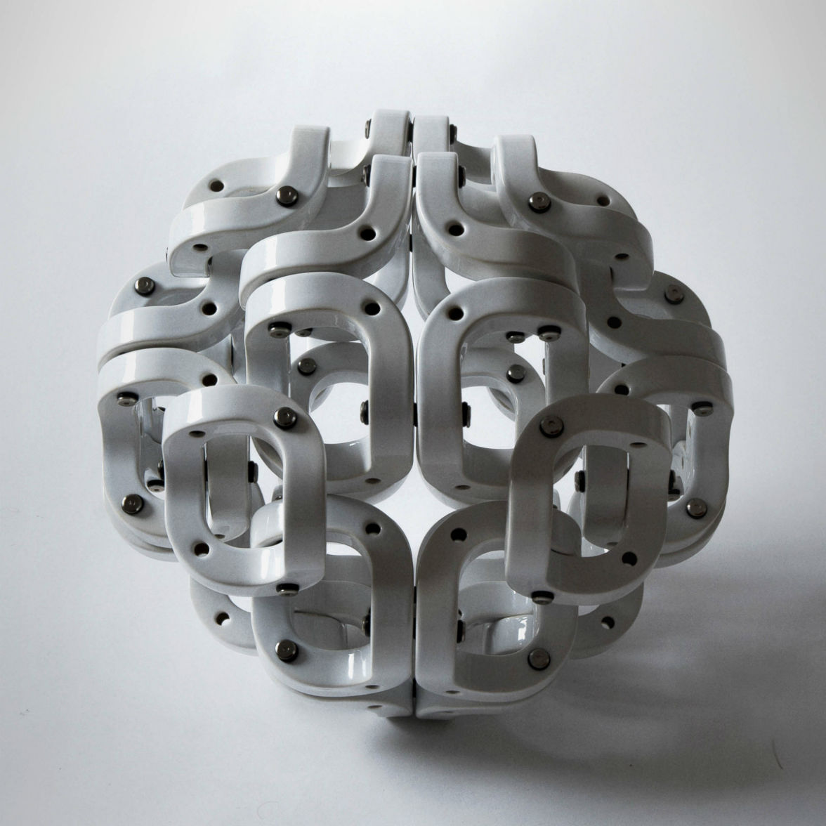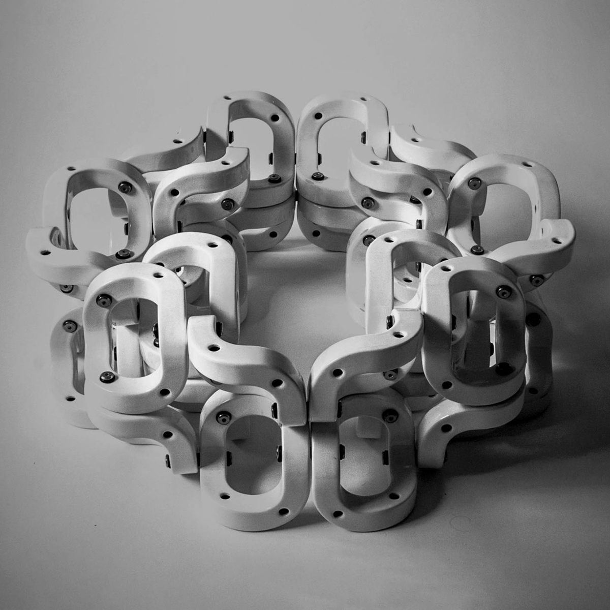 This sculptural geometric system emerged, inspired by the modular possibilities of the cuboctahedron as outlined in Buckminster Fuller’s Synergetics, a seminal work in contemporary geometric studies.