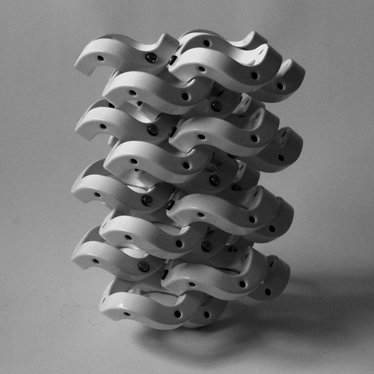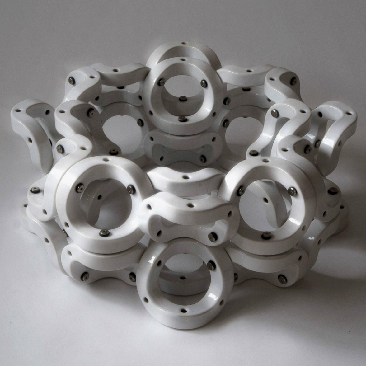 Designer Pedro Cerisola, renowned for his innovative approach to modular fabrication, was immediately drawn to the cuboctahedron’s modular potential. With a tireless commitment to experimentation and exploration, Cerisola has created a series of ethereal yet intricately detailed structures from a single ceramic piece that elicits the visual sensation of clusters of clouds suspended in mid-air.