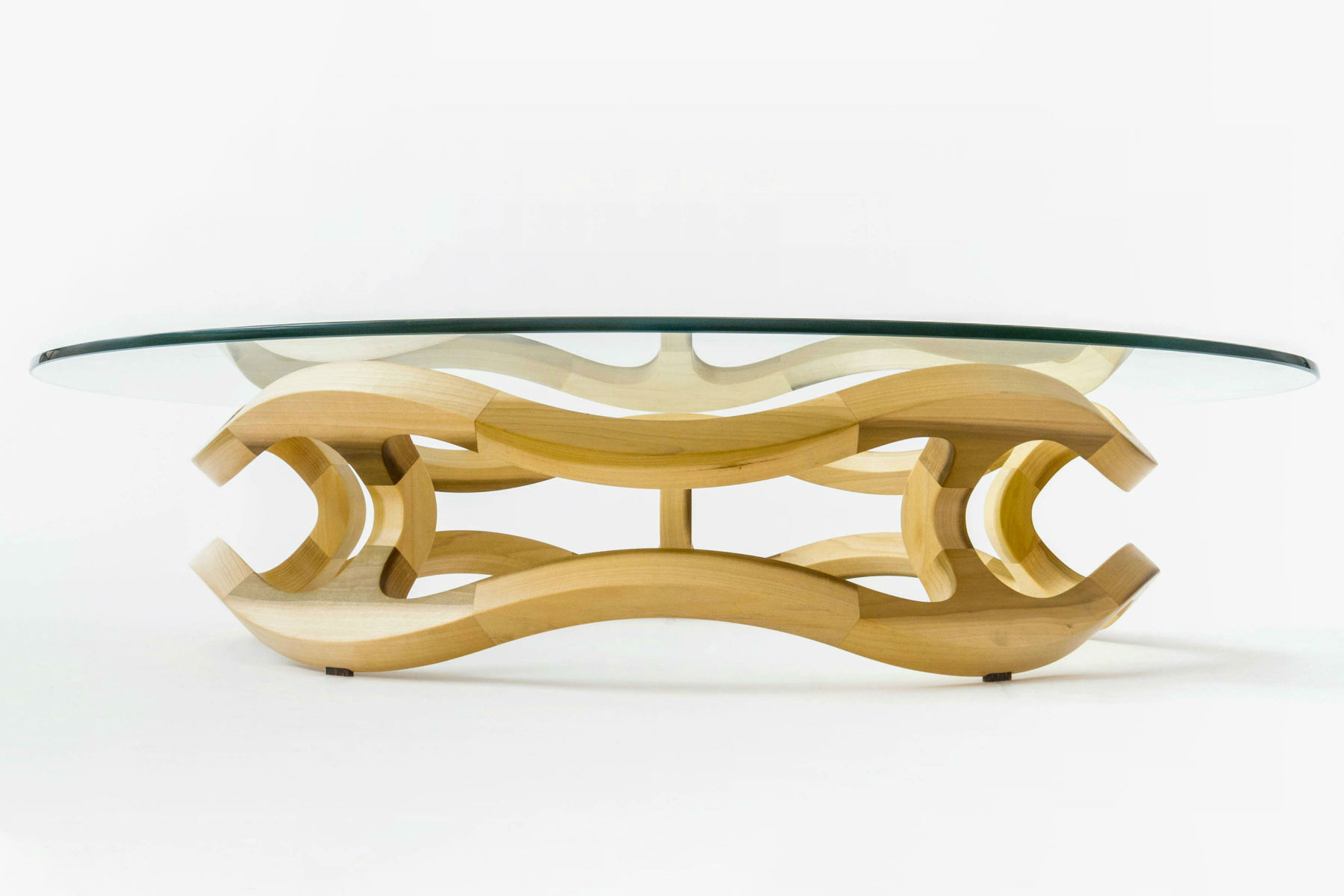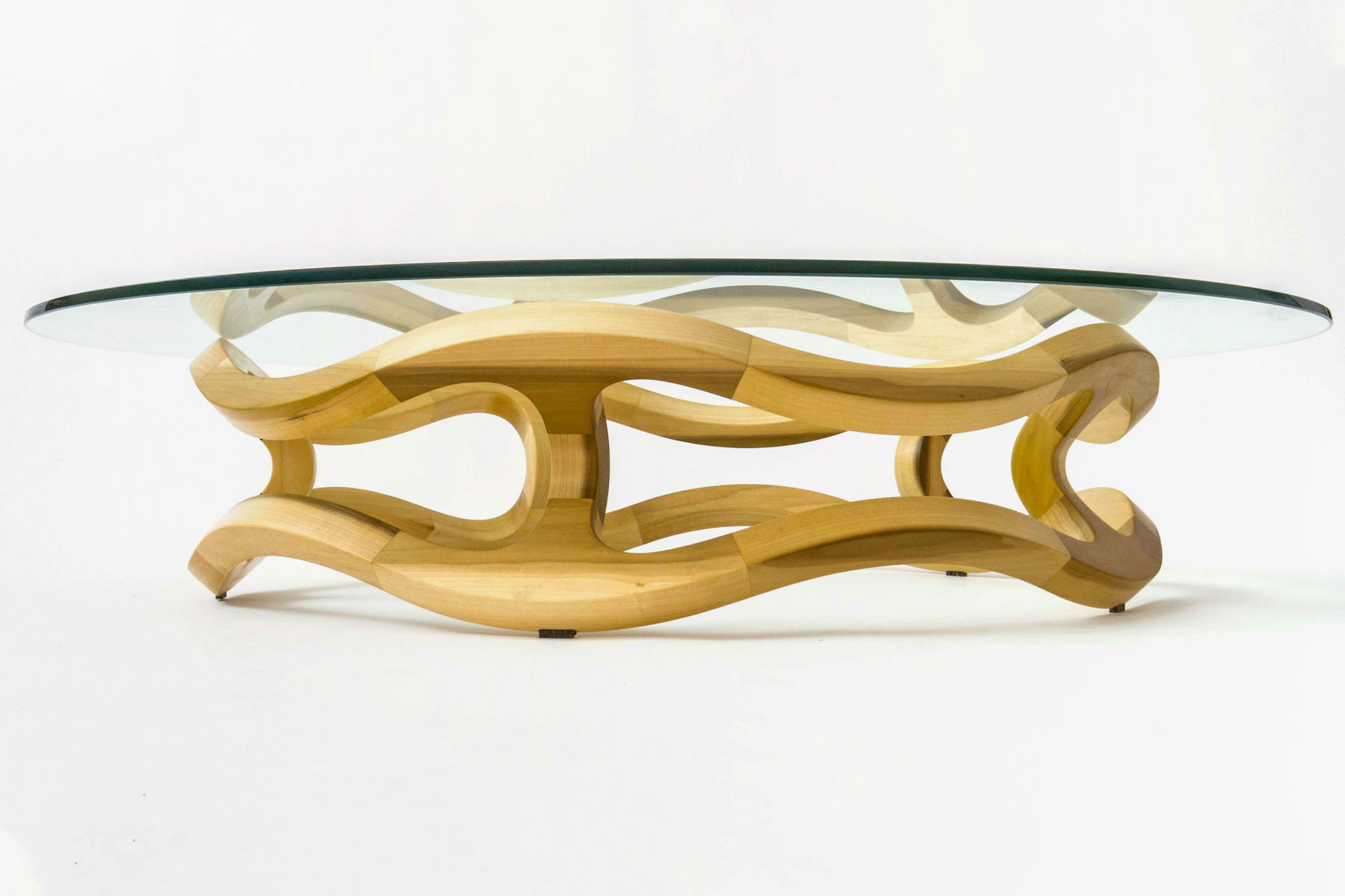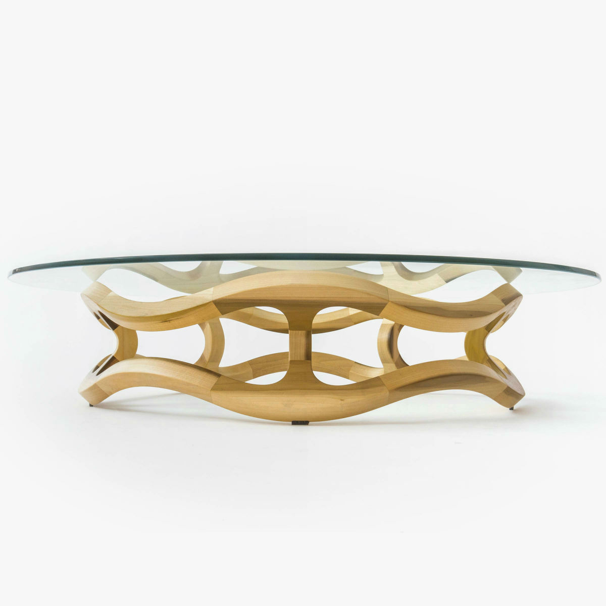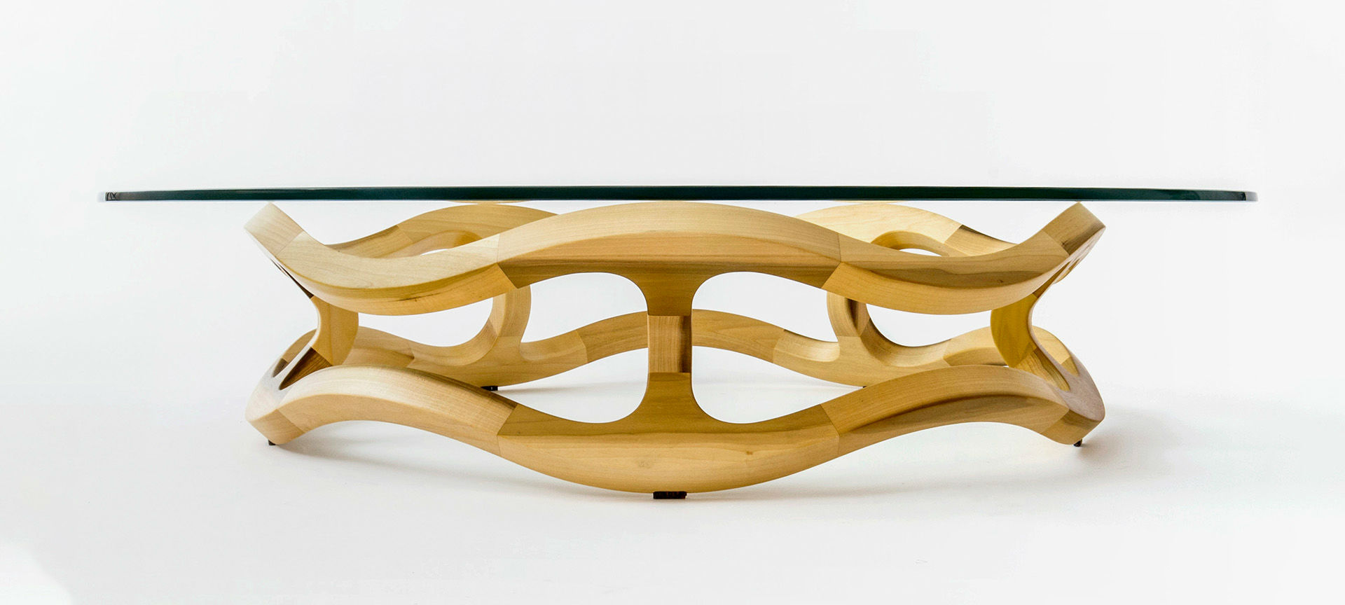 The table is weighed down by a transparent glass surface, enhancing the sculptural qualities of the furniture.