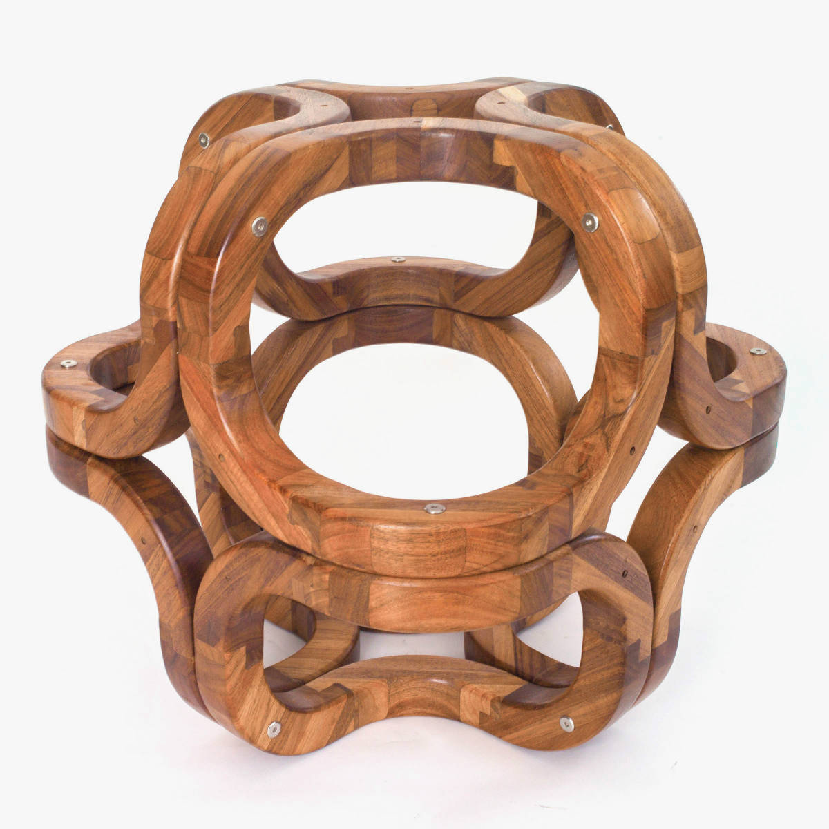 This structure is conformed of eight handcrafted modules, each fabricated from a single CNC cut solid tzalam wood piece. The union of the modules is done based on the geometry of the octahedron. The assembly of the pieces, the polishing and the final finish in natural oil is carried out manually.