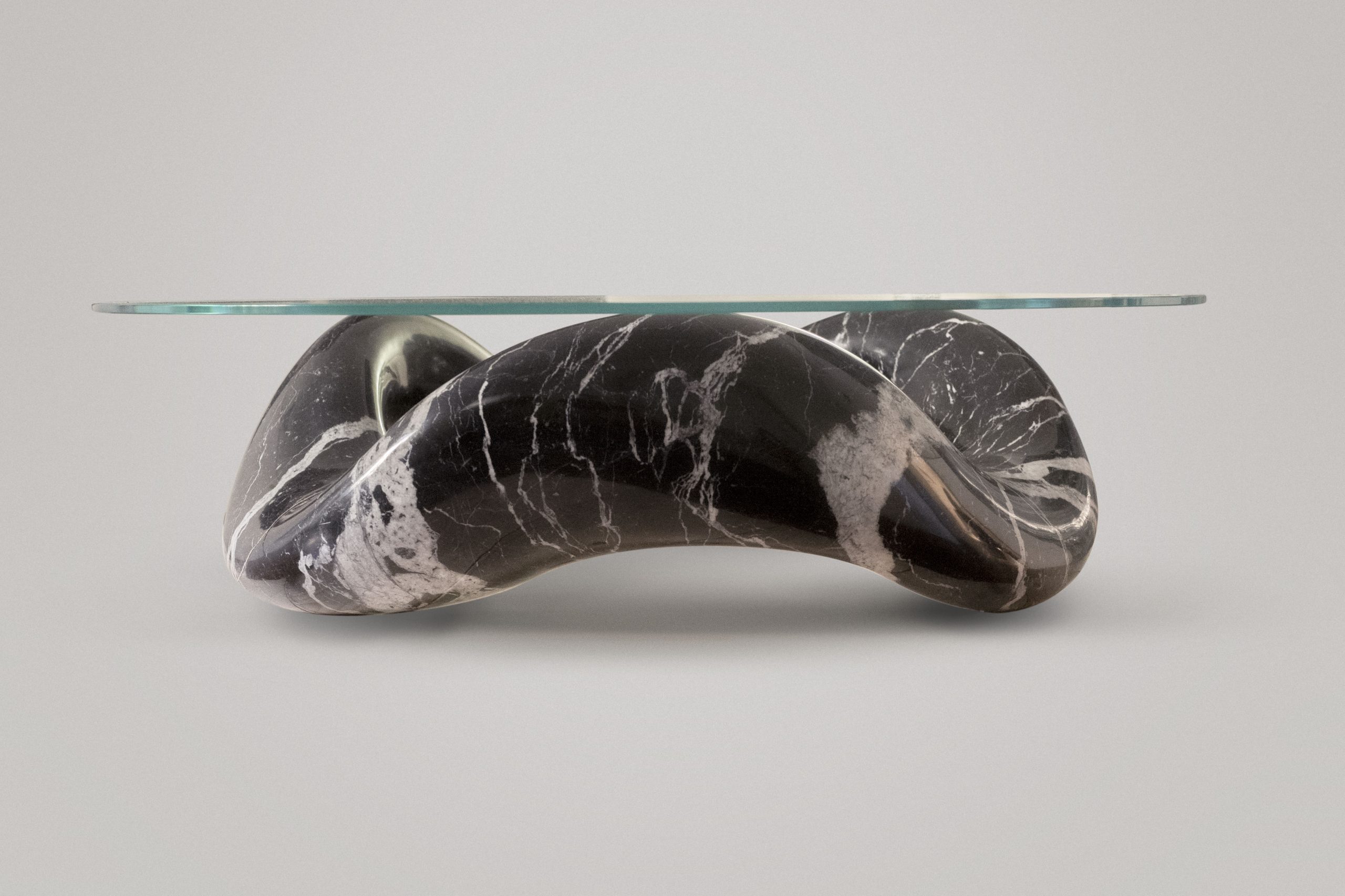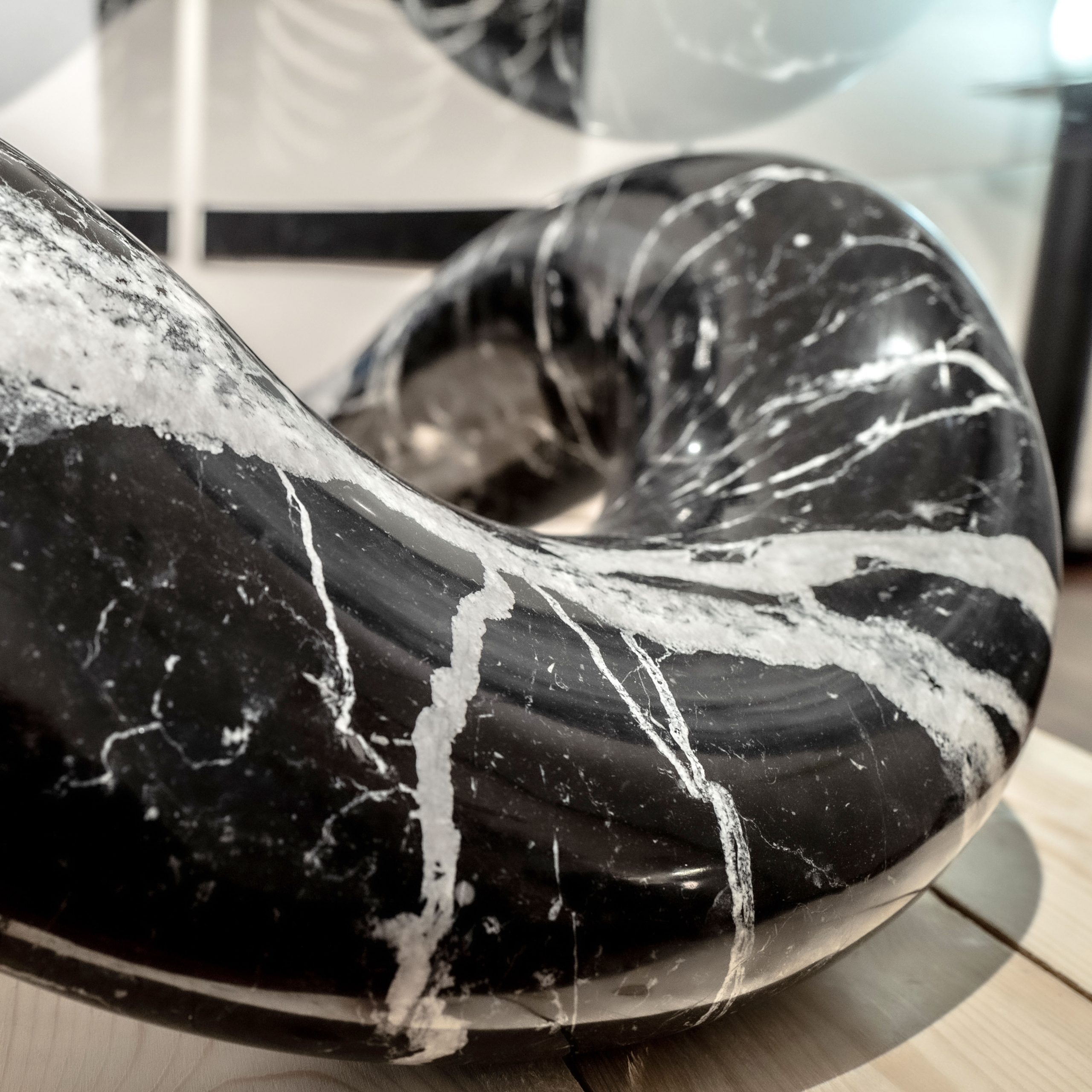A table base that seamlessly blends the inherent beauty of marble with fluidity and mathematical intrigue. Crafted in Carrara, Italy, each Moebius piece undergoes meticulous sculpting using a state-of-the-art 5-axis robotic arm, delicately shaping exquisite Nero de Marquina marble sourced from the Markina region in the Basque Country.