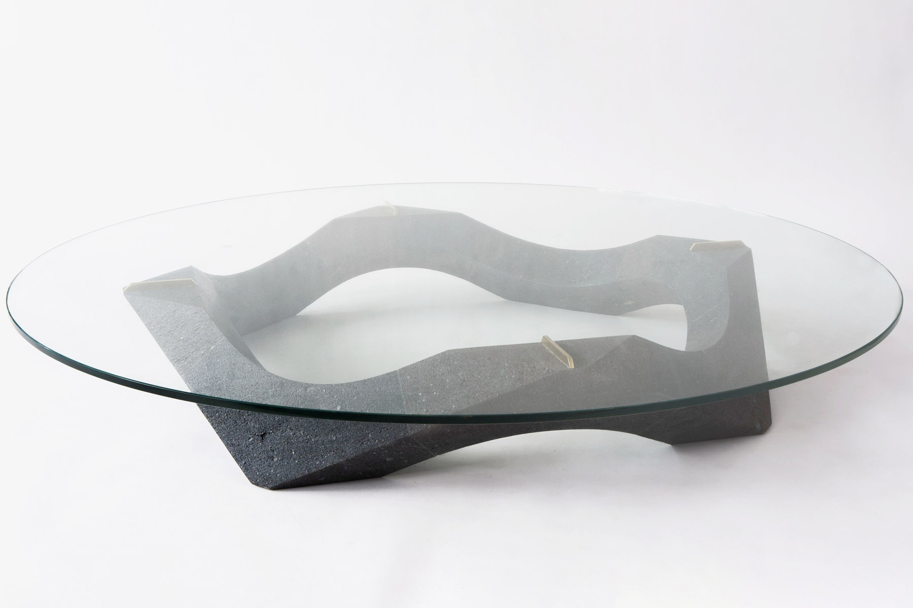 The materiality of both lava stone and glass embody in this piece the seemingly opposing spirits of robustness and delicacy. Each module is carved manually from a monolithic piece of lava stone.