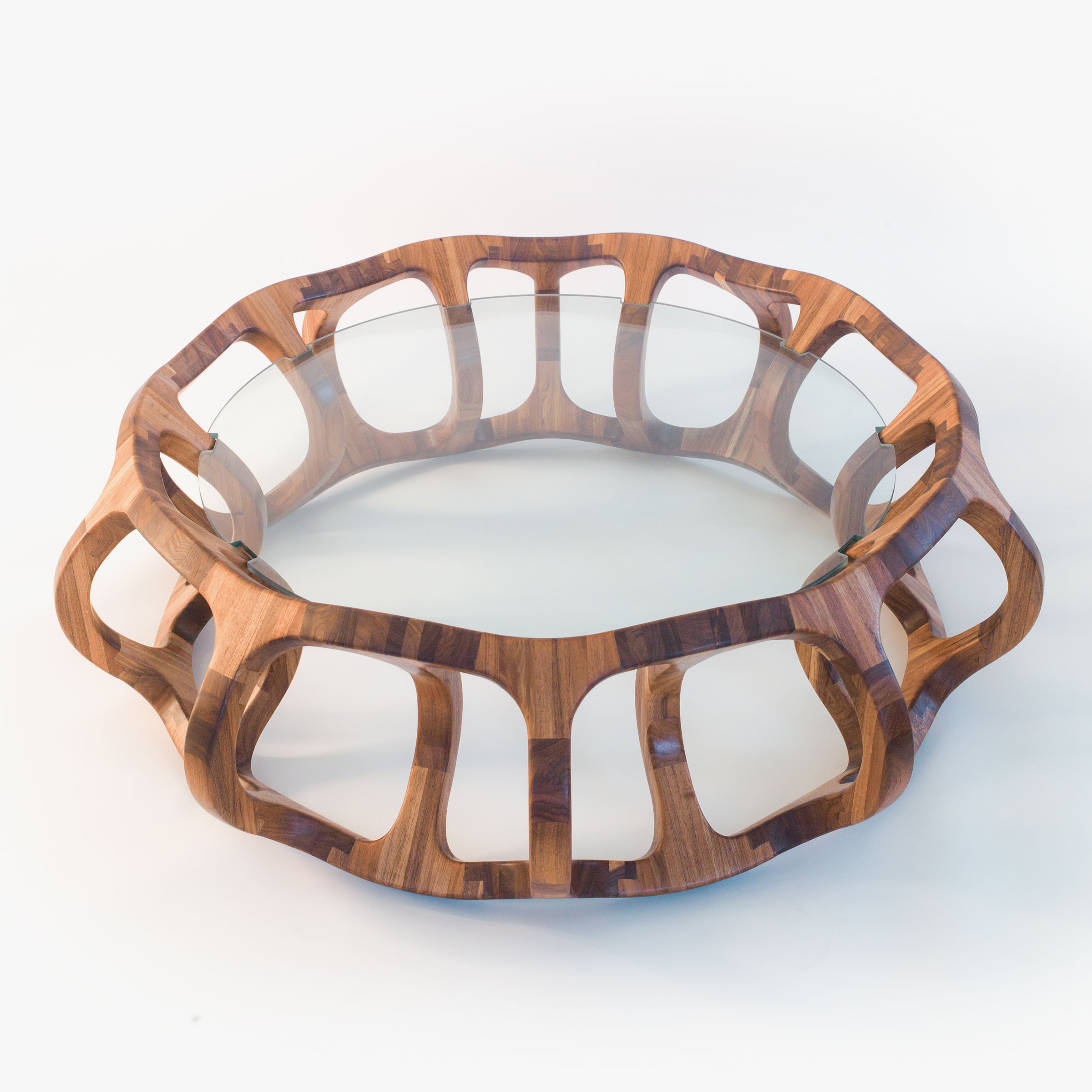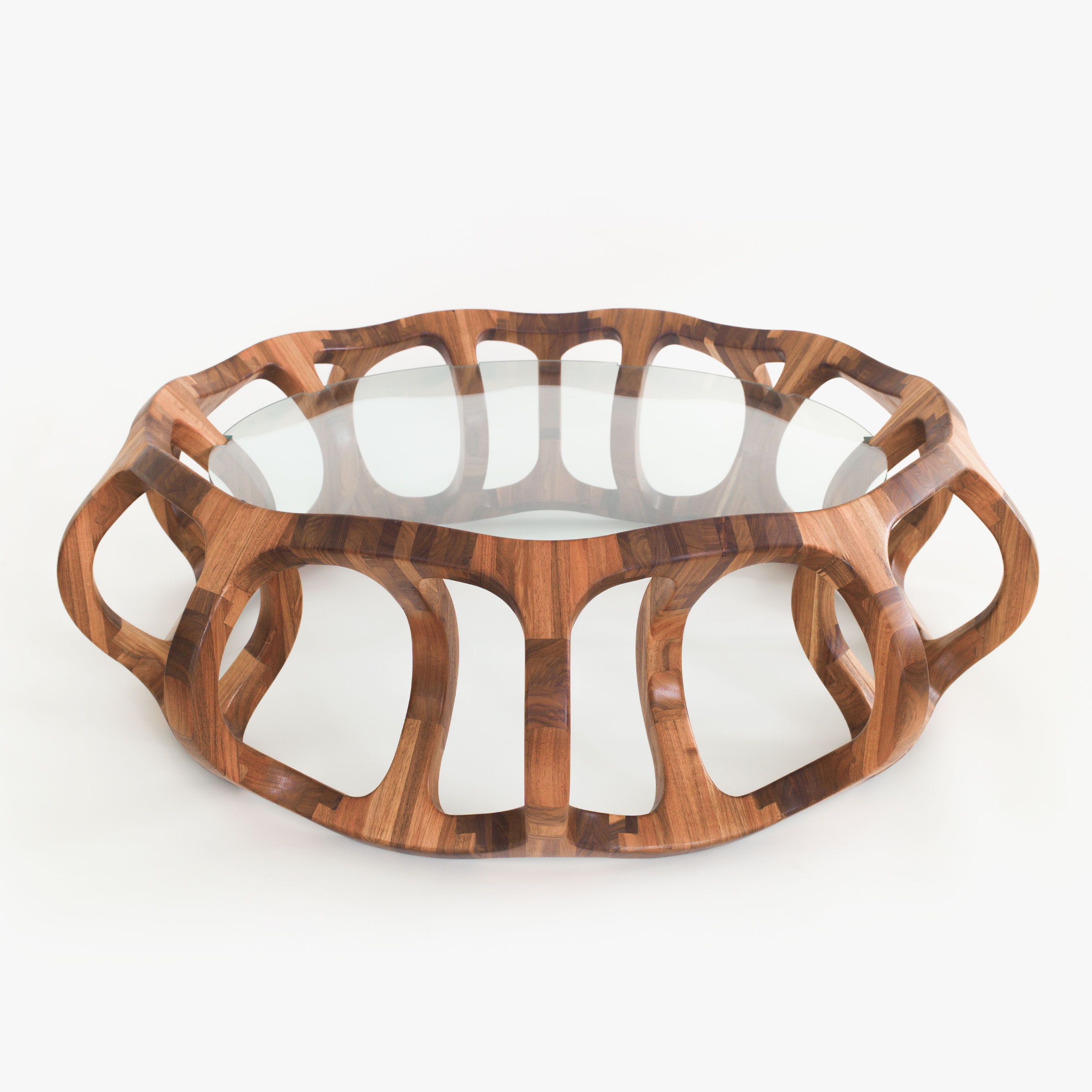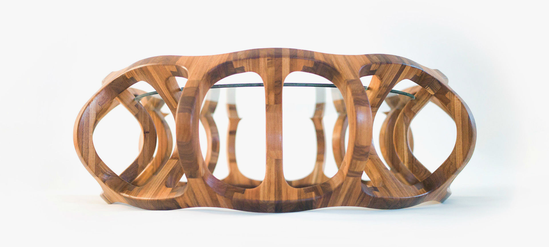The glass surface helps preserve the sculptural qualities of the piece. Its transparency creates a floating area contained within the wooden structure that allows the user to appreciate the beauty of the the material and the patterns generated by its veins and joinery.