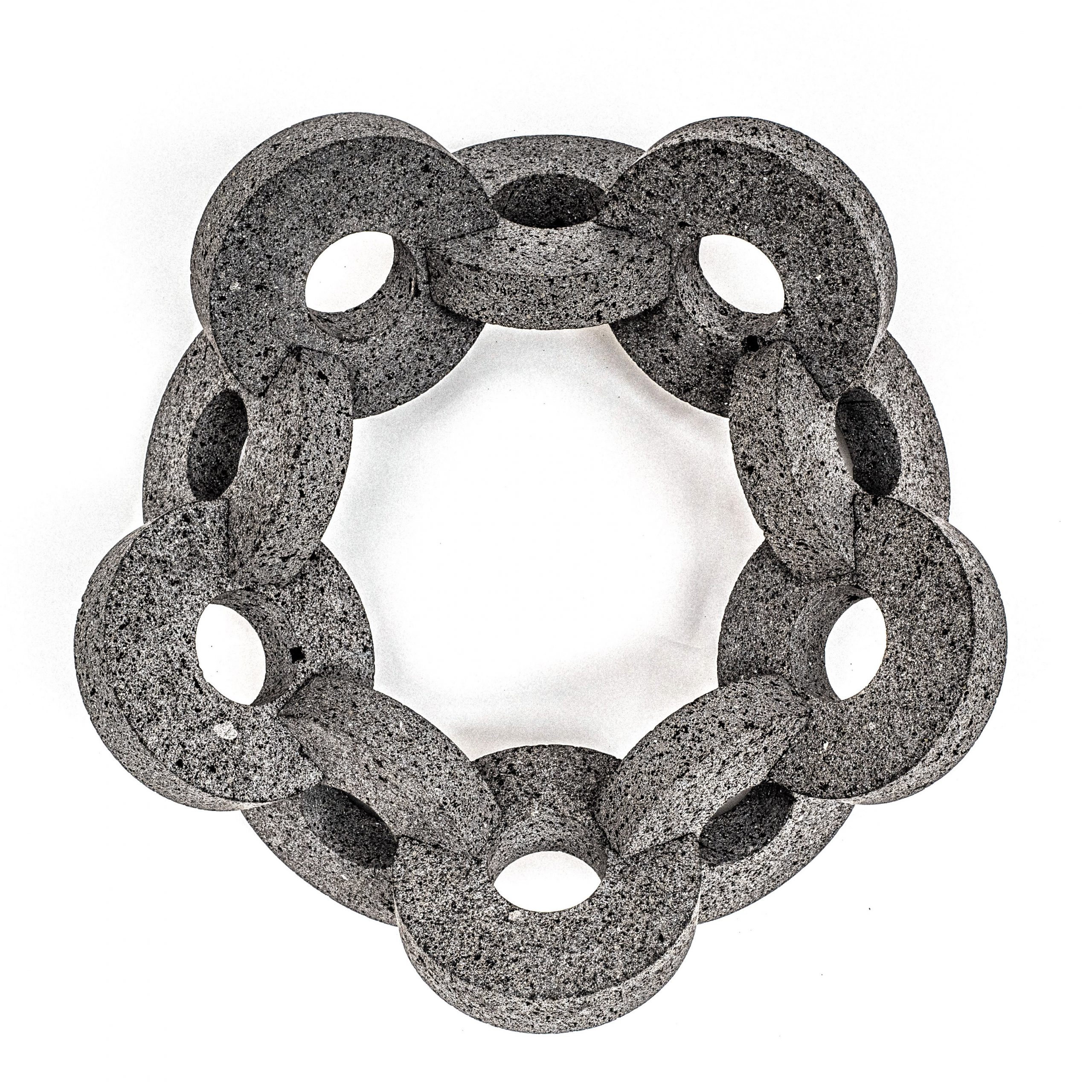 Drawing inspiration from the prehispanic ball game, the Ulama Table is a sculptural masterpiece that pays tribute to Mexico’s rich cultural heritage. The circular structure of the table, formed from ten identical modules, is carved manually from a single monolithic piece of lava stone. The delicacy of the glass top juxtaposes beautifully with the rough and raw texture of the stone base, resulting in a harmonious balance of opposing forces. The Ulama Table is a testament to the skill and craftsmanship of the artisans who bring this exceptional piece to life. It showcases Estudio Cerisola’s dynamic understanding of geometry and its commitment to pushing the boundaries of modular design.